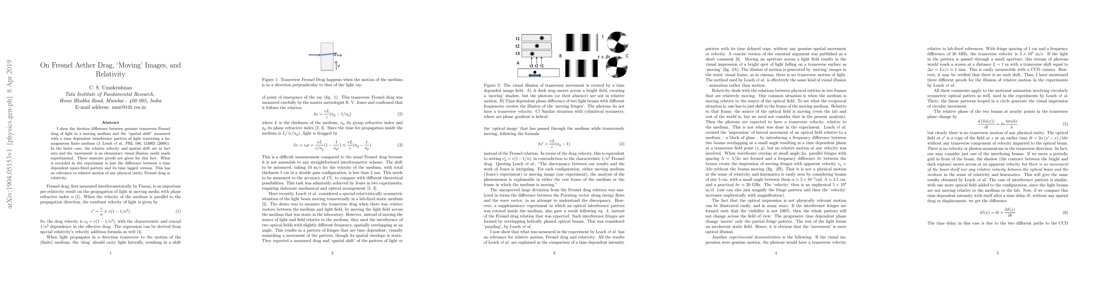 I show the decisive difference between genuine transverse Fresnel drag of light in a moving medium and the "spatial shift" measured with a time dependent interference pattern of light traversing a homogeneous finite medium (J. Leach et al., PRL 100, 153902 (2008)). In the latter case, the relative velocity and spatial shift are in fact zero and the `movement' is an elementary visual illusion, easily made superluminal. Three separate proofs are given for this fact. What is recorded in the experiment is just the difference between a time dependent space-fixed pattern and its time lagged version. This has no relevance to relative motion of any physical entity, Fresnel drag or relativity.