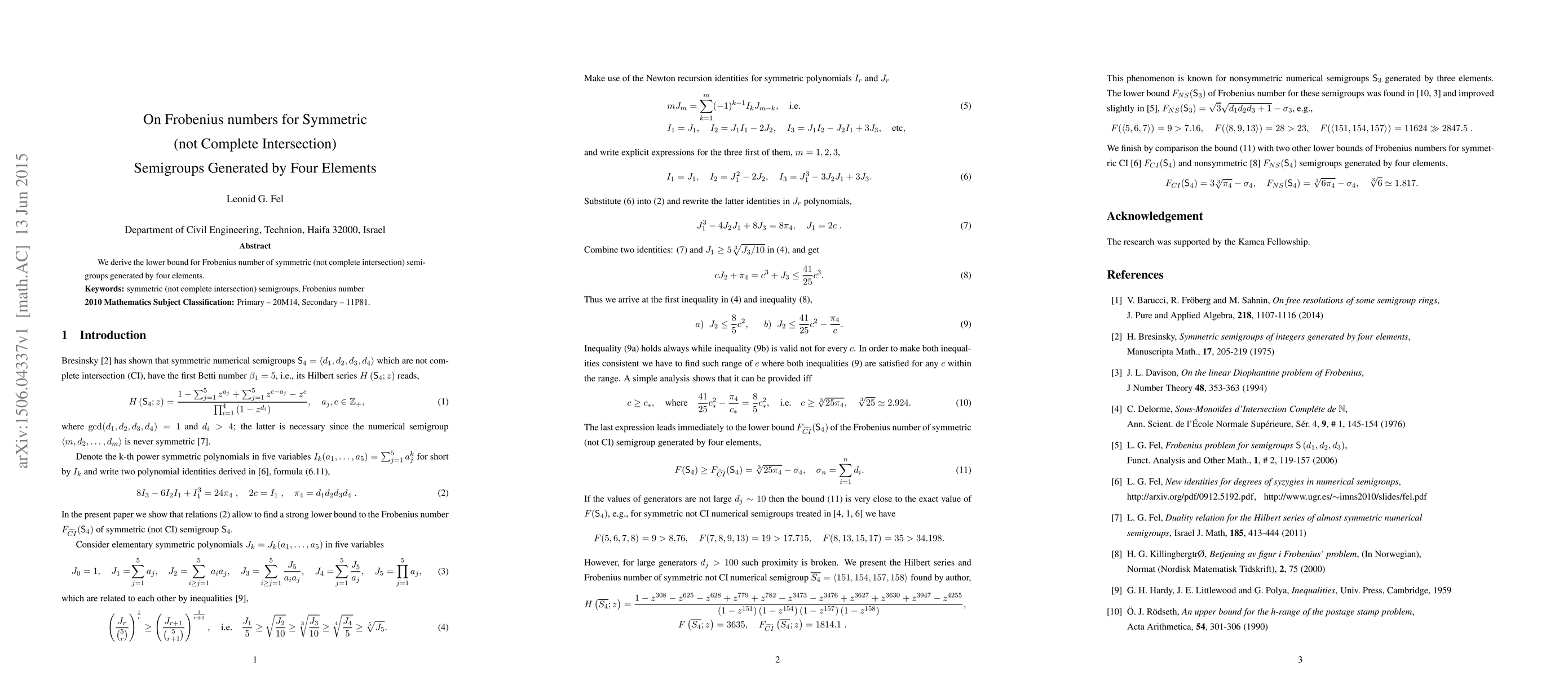Summary: This paper establishes a lower bound for the Frobenius number of symmetric semigroups, which are not complete intersections, generated by four elements. The findings contribute to the understanding of arithmetic properties of these semigroups.