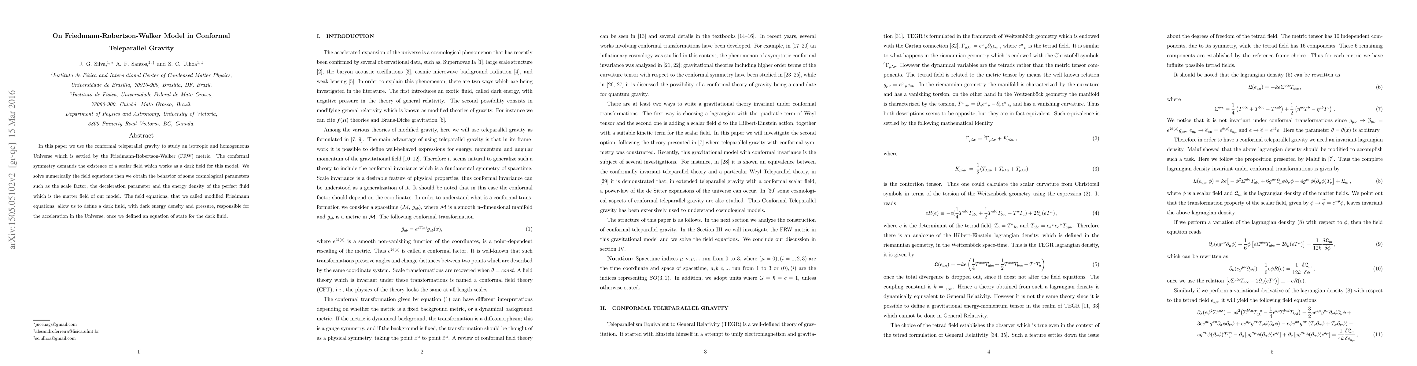 This research applies conformal teleparallel gravity to an isotropic and homogeneous universe modeled by the FRW metric, deriving modified Friedmann equations. These equations describe a dark fluid driving cosmic acceleration, with calculated scale factor, deceleration parameter, and dark energy density.