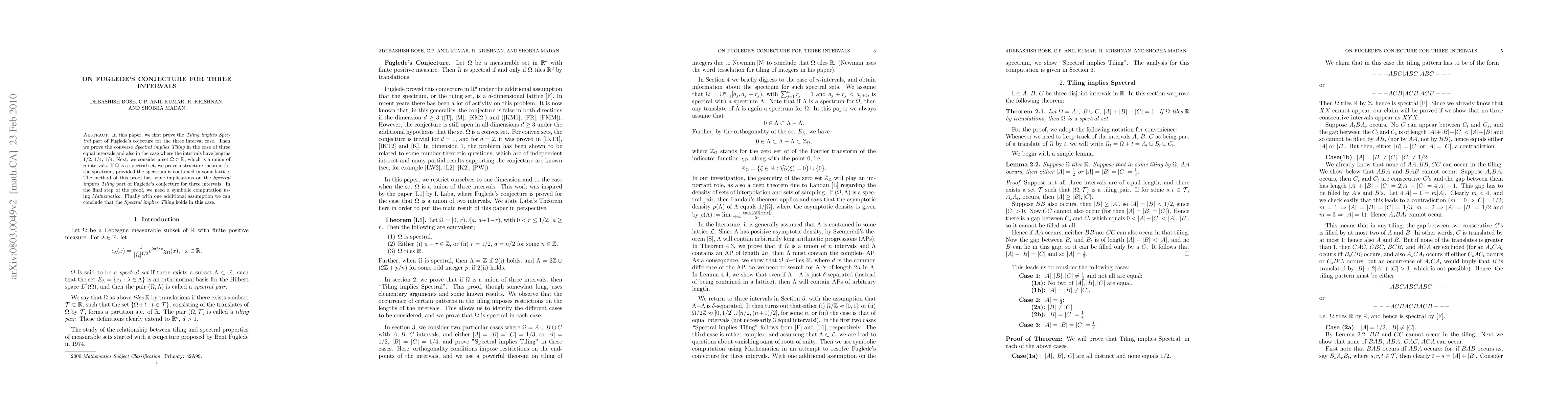In this paper we prove the "Tiling implies Spectral" part of Fuglede's paper for the case of three intervals. Then we prove the "Spectral implies Tiling" part of the conjecture for the case of three equal intervals as also when the intervals have lengths 1/2, 1/4, 1/4. For the general case we change our approach to get information on the structure of the spectrum for the n-interval case. Finally, we use symbolic computations on Mathematica, and prove this part of the conjecture with an additional assumption on the spectrum.