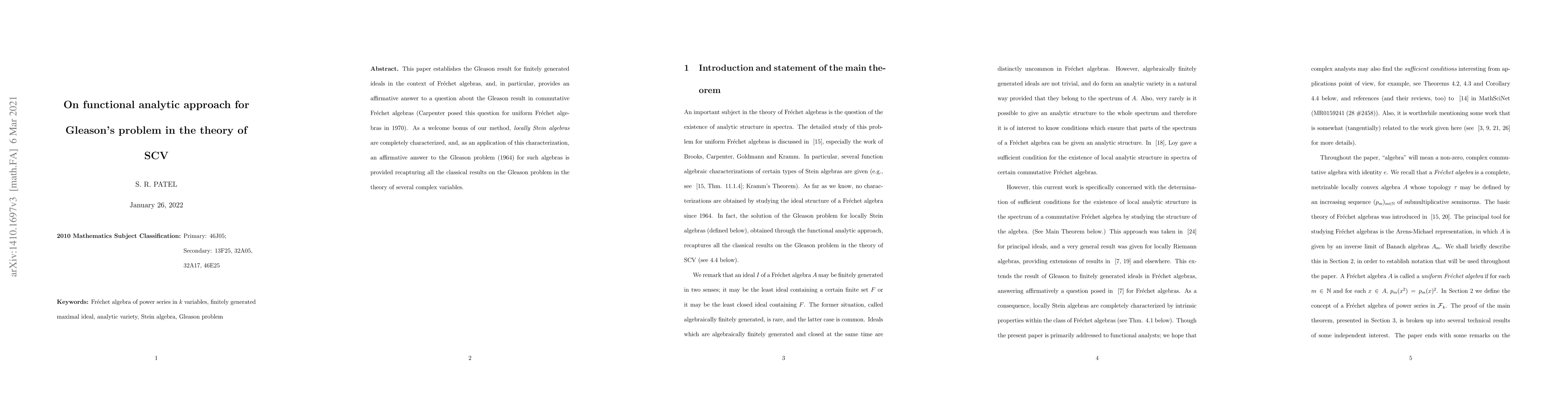 This paper establishes the Gleason result for finitely generated ideals in the context of Frechet algebras, and, in particular, provides an affirmative answer to a question about the Gleason result in commutative Frechet algebras (Carpenter posed this question for uniform Frechet algebras in 1970). As a welcome bonus of our method, locally Stein algebras are completely characterized, and, as an application of this characterization, an affirmative answer to the Gleason problem (1964) for such algebras is provided recapturing all the classical results on the Gleason problem in the theory of several complex variables.