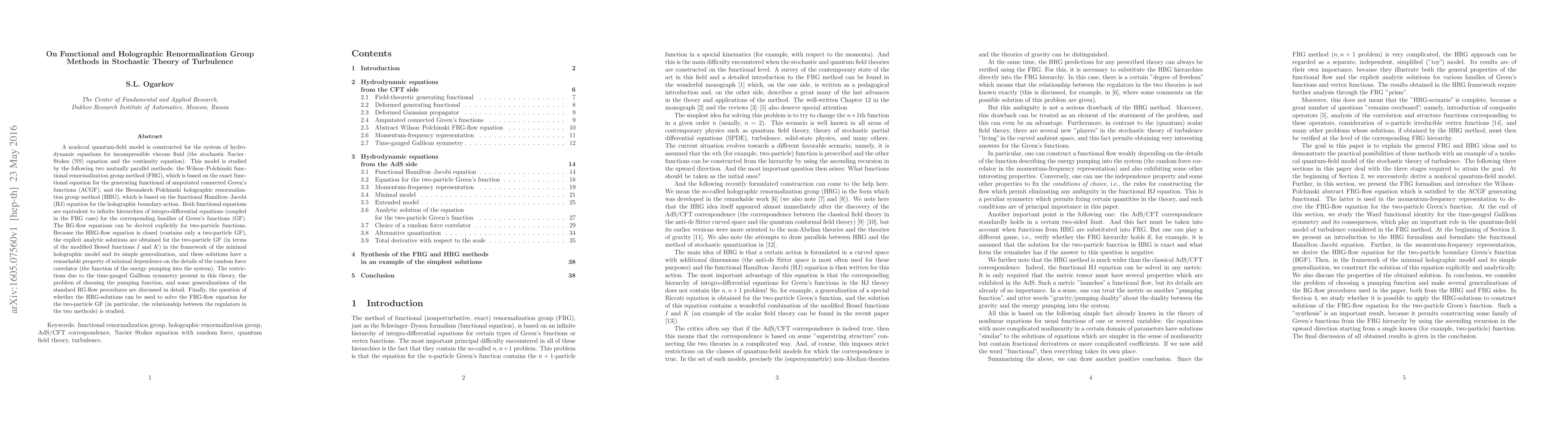 A nonlocal quantum-field model is constructed for the system of hydrodynamic equations for incompressible viscous fluid (the stochastic Navier--Stokes (NS) equation and the continuity equation). This model is studied by the following two mutually parallel methods: the Wilson--Polchinski functional renormalization group method (FRG), which is based on the exact functional equation for the generating functional of amputated connected Green's functions (ACGF), and the Heemskerk--Polchinski holographic renormalization group method (HRG), which is based on the functional Hamilton--Jacobi (HJ) equation for the holographic boundary action. Both functional equations are equivalent to infinite hierarchies of integro-differential equations (coupled in the FRG case) for the corresponding families of Green's functions (GF). The RG-flow equations can be derived explicitly for two-particle functions. Because the HRG-flow equation is closed (contains only a two-particle GF), the explicit analytic solutions are obtained for the two-particle GF (in terms of the modified Bessel functions $I$ and $K$) in the framework of the minimal holographic model and its simple generalization, and these solutions have a remarkable property of minimal dependence on the details of the random force correlator (the function of the energy pumping into the system). The restrictions due to the time-gauged Galilean symmetry present in this theory, the problem of choosing the pumping function, and some generalizations of the standard RG-flow procedures are discussed in detail. Finally, the question of whether the HRG-solutions can be used to solve the FRG-flow equation for the two-particle GF (in particular, the relationship between the regulators in the two methods) is studied.