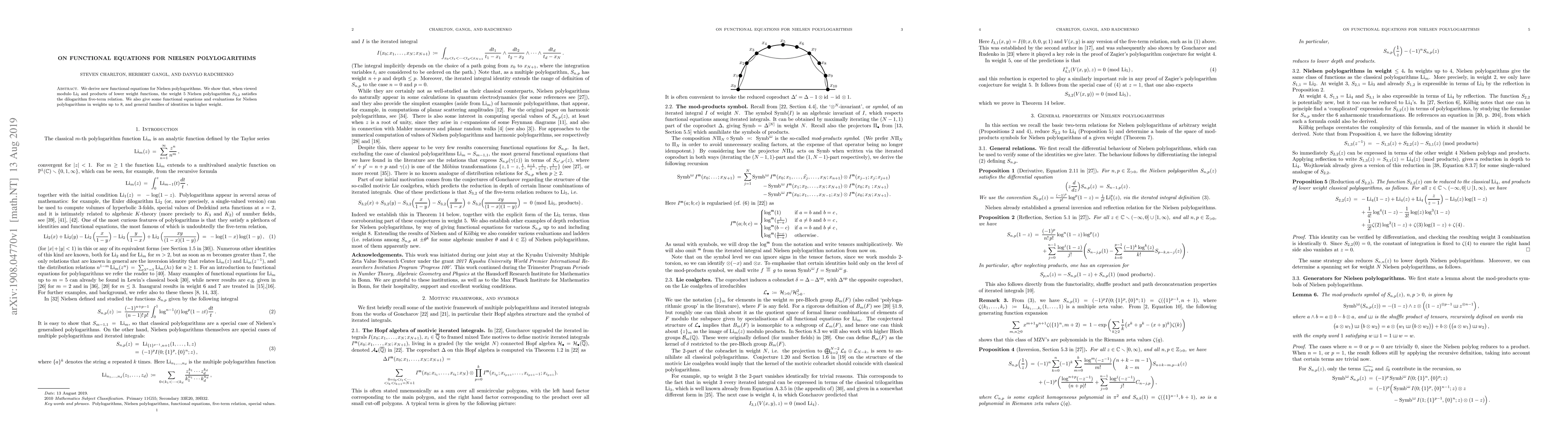 This paper derives new functional equations for Nielsen polylogarithms, specifically showing that the weight 5 function $S_{3,2}$ satisfies a dilogarithm five-term relation modulo $\mathrm{Li}_5$ and lower weight products. It also provides functional equations and evaluations for weights up to 8 and discusses general identities for higher weights.