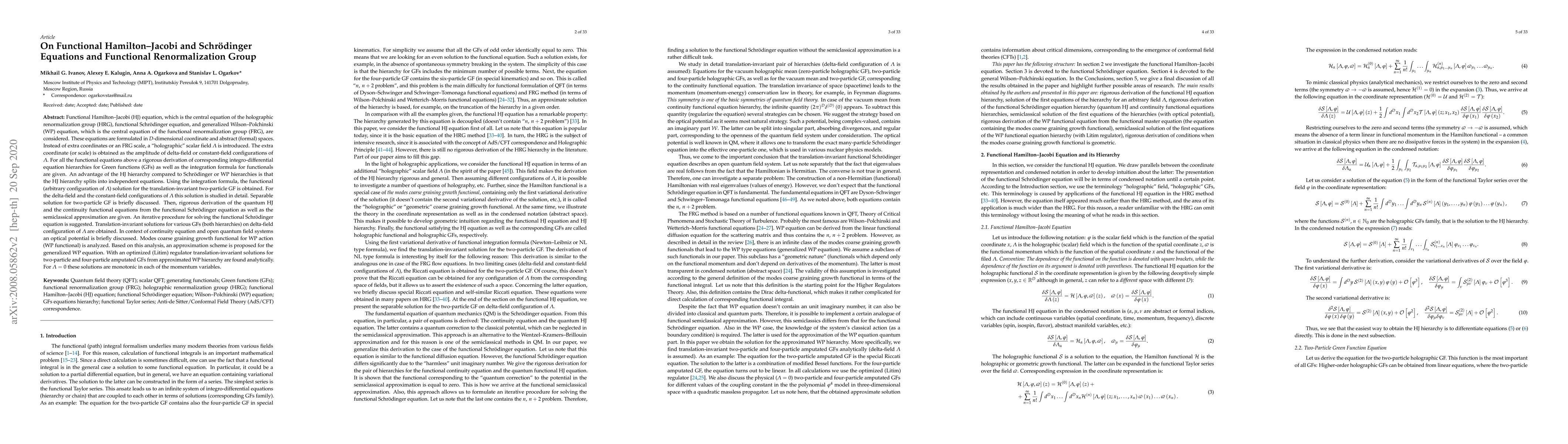 This paper explores the functional Hamilton-Jacobi and Schrödinger equations within the framework of holographic and functional renormalization group theories. It introduces a holographic scalar field to replace extra coordinates or scales, deriving integro-differential hierarchies for Green functions and proposing an iterative method for solving the functional Schrödinger equation. Analytical solutions for translation-invariant two-particle Green functions under delta-field and constant field configurations of the scalar field are obtained, and an approximation scheme for the generalized Wilson-Polchinski equation is suggested.