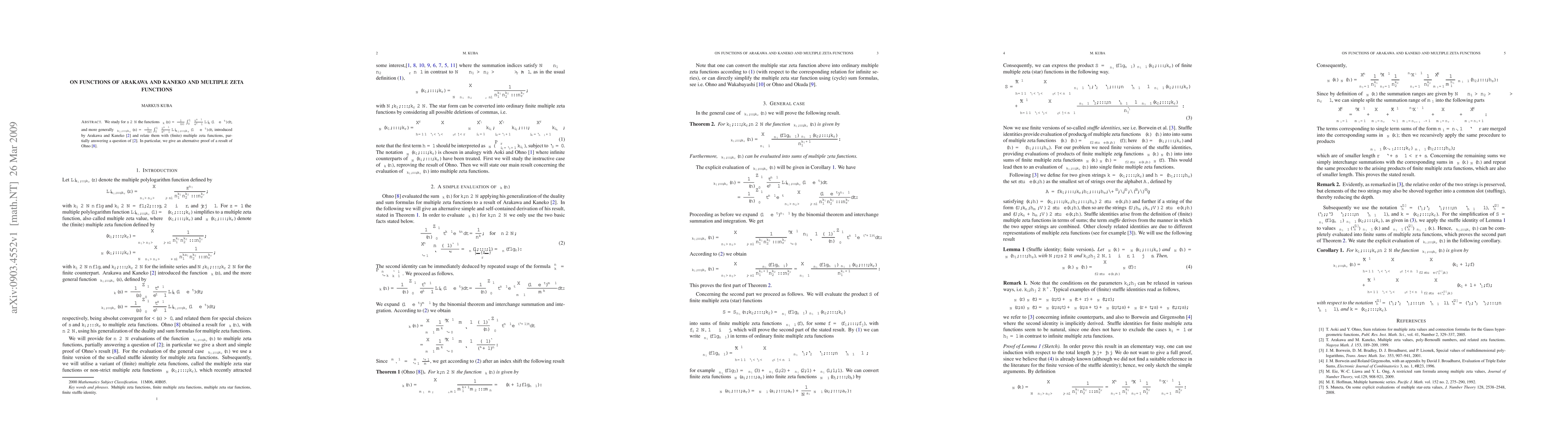 We study for $s\in\N=\{1,2,...\}$ the functions $\xi_{k}(s)=\frac{1}{\Gamma(s)}\int_{0}^{\infty}\frac{t^{s-1}}{e^t-1}\Li_{k}(1-e^{-t})dt$, and more generally $\xi_{k_1,...,k_r}(s)=\frac{1}{\Gamma(s)}\int_{0}^{\infty}\frac{t^{s-1}}{e^t-1}\Li_{k_1,...,k_r}(1-e^{-t})dt$, introduced by Arakawa and Kaneko \cite{Arakawa} and relate them with (finite) multiple zeta functions, partially answering a question of \cite{Arakawa}. In particular, we give an alternative proof of a result of Ohno \cite{Ohno2}.