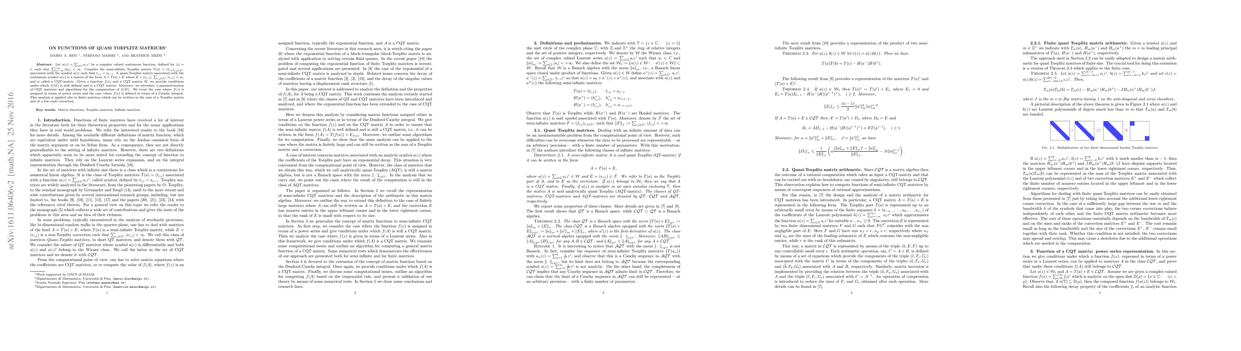 This paper explores the functions of quasi-Toeplitz matrices, providing conditions for well-defined operations on these matrices and introducing algorithms for computing such functions. It also covers parametrizations and applies the analysis to finite matrices represented as a Toeplitz matrix plus a low-rank correction.
