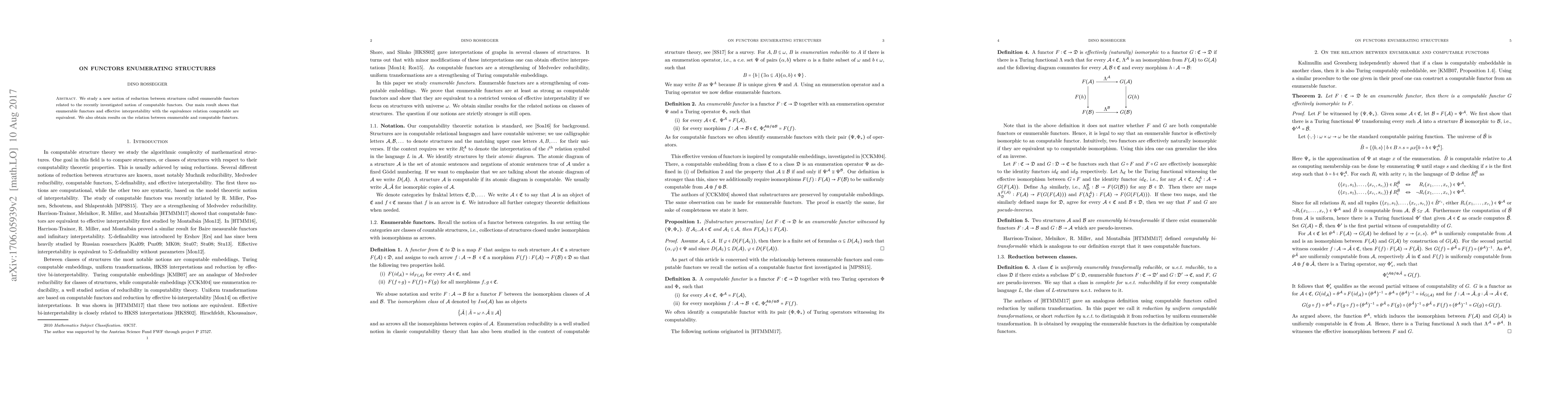 This paper introduces enumerable functors, a new type of reduction between structures, and demonstrates their equivalence to effective interpretability under computable equivalence relations. It also explores the relationship between enumerable and computable functors.