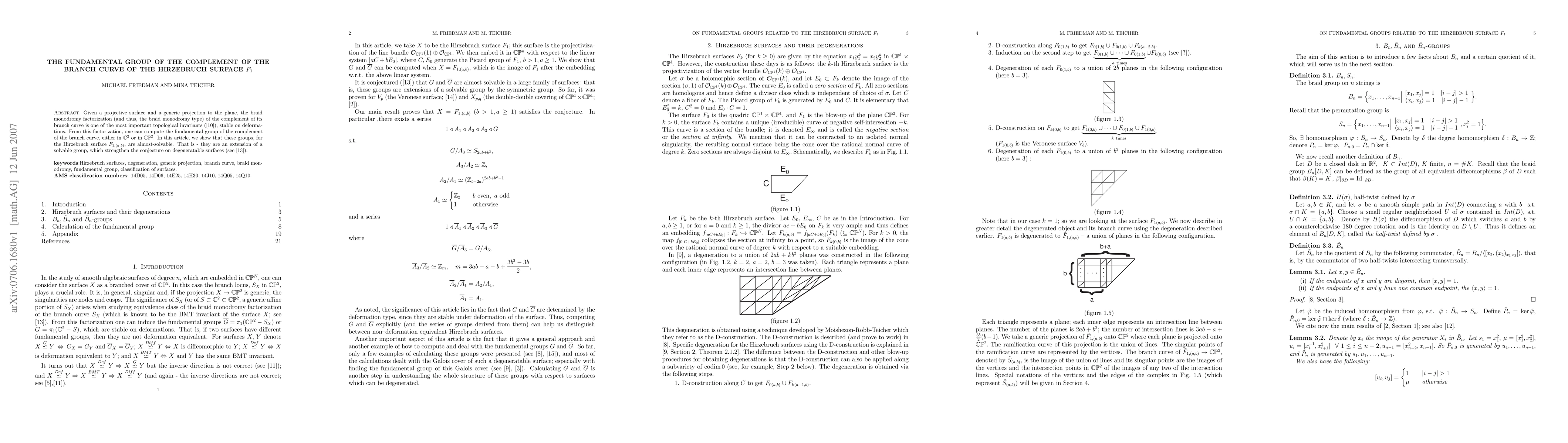 Given a projective surface and a generic projection to the plane, the braid monodromy factorization (and thus, the braid monodromy type) of the complement of its branch curve is one of the most important topological invariants, stable on deformations. From this factorization, one can compute the fundamental group of the complement of the branch curve, either in C^2 or in CP^2. In this article, we show that these groups, for the Hirzebruch surface F_{1,(a,b)}, are almost-solvable. That is - they are an extension of a solvable group, which strengthen the conjecture on degeneratable surfaces.
