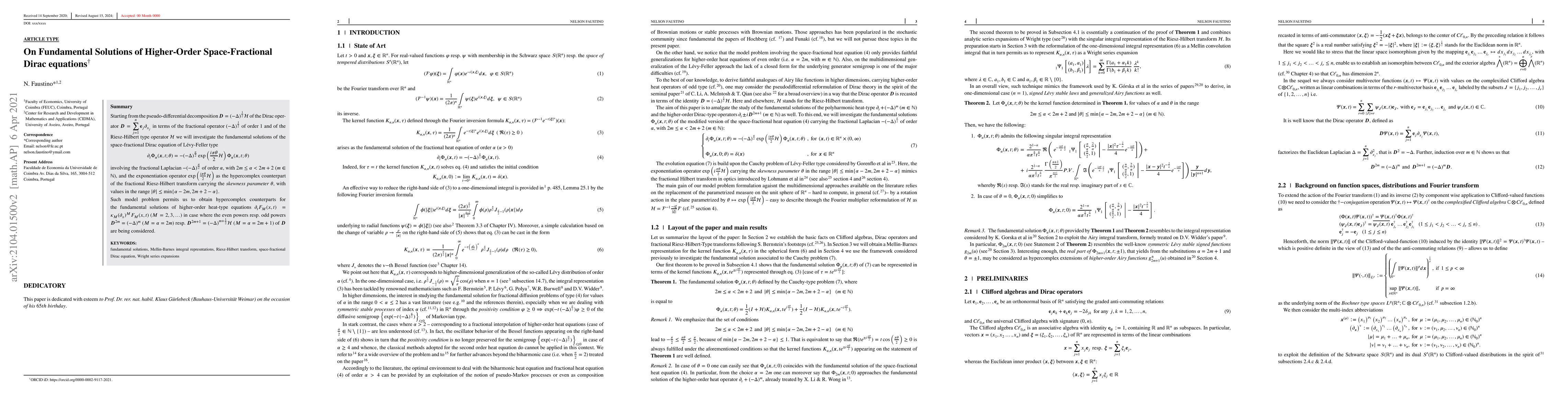 Starting from the pseudo-differential decomposition $\mathbf{D}=(-\Delta)^{\frac{1}{2}}\mathcal{H}$ of the Dirac operator $\displaystyle \mathbf{D}=\sum_{j=1}^n\mathbf{e}_j\partial_{x_j}$ in terms of the fractional operator $(-\Delta)^{\frac{1}{2}}$ of order $1$ and of the Riesz-Hilbert type operator $\mathcal{H}$ we will investigate the fundamental solutions of the space-fractional Dirac equation of L\'evy-Feller type $$\partial_t\Phi_\alpha(\mathbf{x},t;\theta)=-(-\Delta)^{\frac{\alpha}{2}}\exp\left( \frac{i\pi\theta}{2} \mathcal{H}\right)\Phi_\alpha(\mathbb{x},t;\theta) $$ involving the fractional Laplacian $-(-\Delta)^{\frac{\alpha}{2}}$ of order $\alpha$, with $2m\leq \alpha <2m+2$ ($m\in \mathbb{N}$), and the exponentiation operator $\exp\left( \frac{i\pi\theta}{2} \mathcal{H}\right)$ as the hypercomplex counterpart of the fractional Riesz-Hilbert transform carrying the \textit{skewness parameter} $\theta$, with values in the range $|\theta|\leq \min\{\alpha-2m,2m+2-\alpha\}$. Such model problem permits us to obtain hypercomplex counterparts for the fundamental solutions of higher-order heat-type equations $\partial_t F_M(x,t)=\kappa_M(\partial_x)^M F_M(x,t)$ $(M=2,3,\ldots)$ in case where the even powers resp. odd powers $\mathbf{D}^{2m}=(-\Delta)^{m}$ ($M=\alpha=2m$) resp. $\mathbf{D}^{2m+1}=(-\Delta)^{m+\frac{1}{2}}\mathcal{H}$ ($M=\alpha=2m+1$) of $\mathbf{D}$ are being considered.