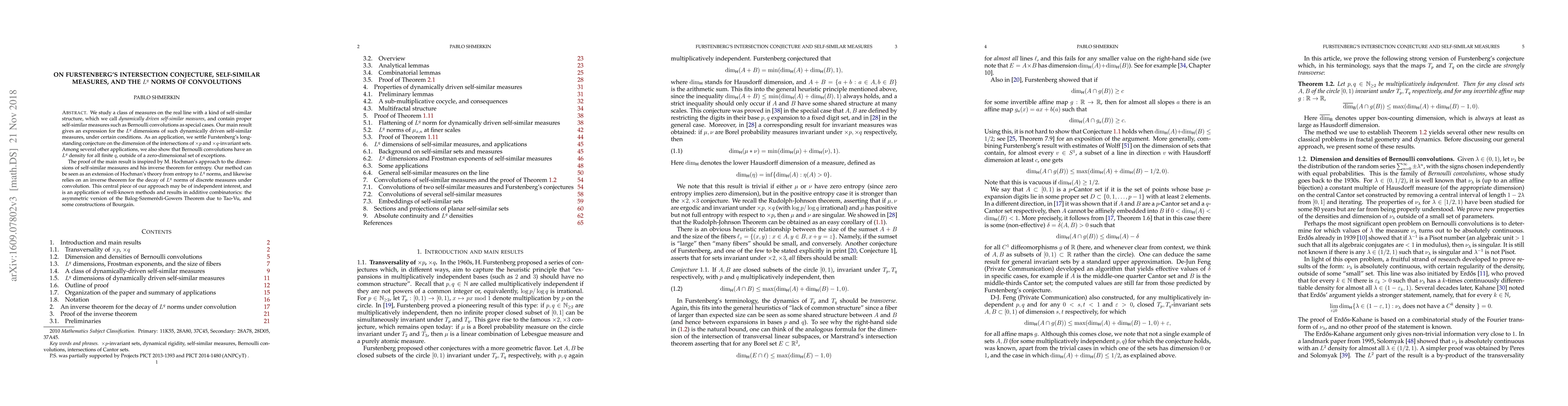 We study a class of measures on the real line with a kind of self-similar structure, which we call dynamically driven self-similar measures, and contain proper self-similar measures such as Bernoulli convolutions as special cases. Our main result gives an expression for the $L^q$-dimensions of such dynamically driven self-similar measures, under certain conditions. As an application, we settle Furstenberg's long-standing conjecture on the dimension of the intersections of $\times p$ and $\times q$-invariant sets. Among several other applications, we also show that Bernoulli convolutions have an $L^q$ density for all finite $q$, outside of a zero-dimensional set of exceptions. The proof of the main result is inspired by M. Hochman's approach to the dimensions of self-similar measures and his inverse theorem for entropy. Our method can be seen as an extension of Hochman's theory from entropy to $L^q$ norms, and likewise relies on an inverse theorem for the decay of $L^q$ norms of discrete measures under convolution. This central piece of our approach may be of independent interest, and is an application of well-known methods and results in additive combinatorics: the asymmetric version of the Balog-Szemer\'{e}di-Gowers Theorem due to Tao-Vu, and some constructions of Bourgain.