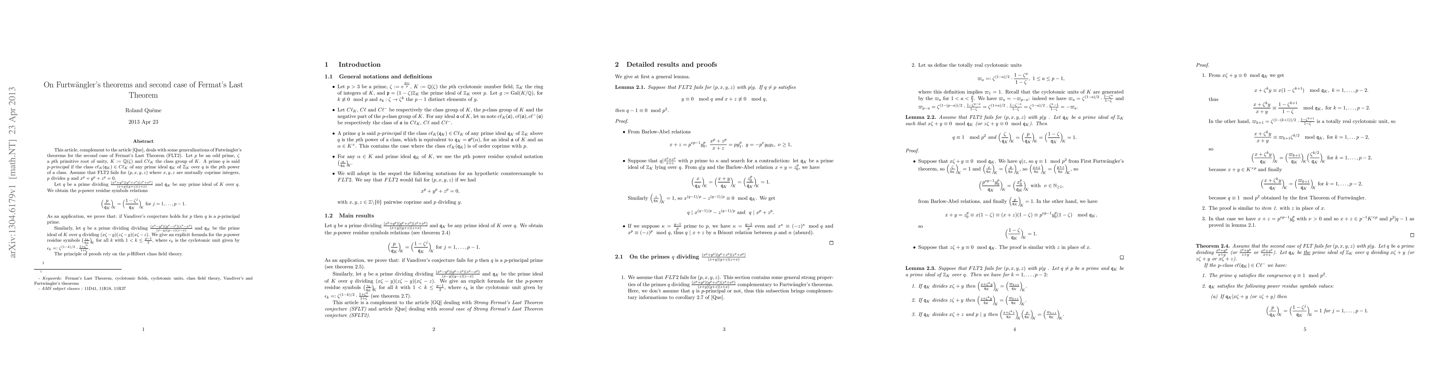 This paper explores generalizations of Furtwängler's theorems in relation to the second case of Fermat's Last Theorem (FLT2), establishing $p$-power residue symbol relations and proving that if Vandiver's conjecture holds for $p$, then $q$ is a $p$-principal prime. The proofs leverage $p$-Hilbert class field theory.
