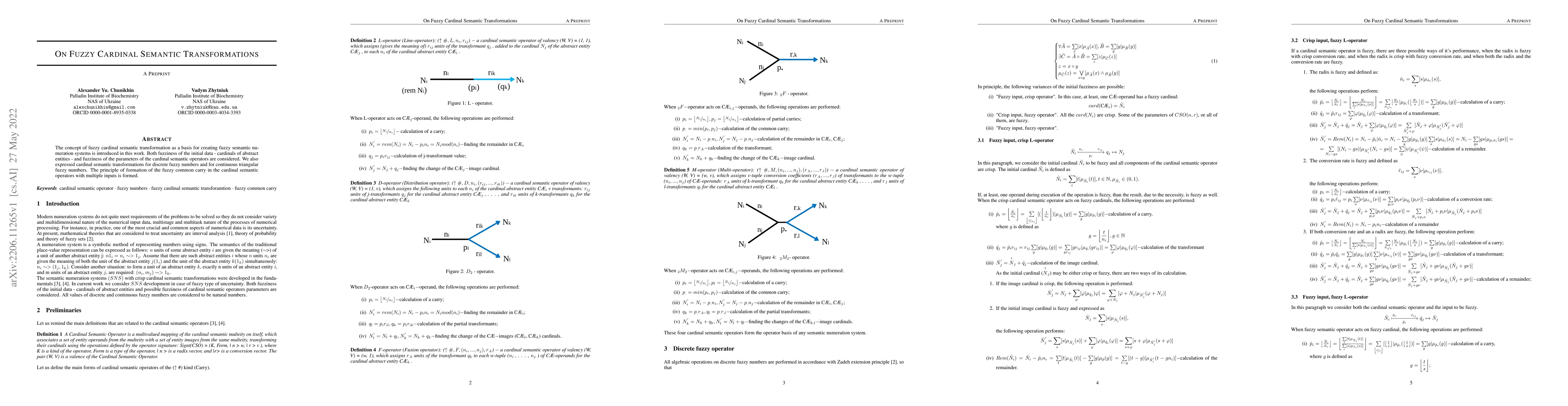 This paper introduces the concept of fuzzy cardinal semantic transformations for developing fuzzy semantic numeration systems, considering both initial data fuzziness and operator parameter fuzziness. It also formulates transformations for discrete and continuous triangular fuzzy numbers and outlines the principle of fuzzy common carry in multi-input operators.
