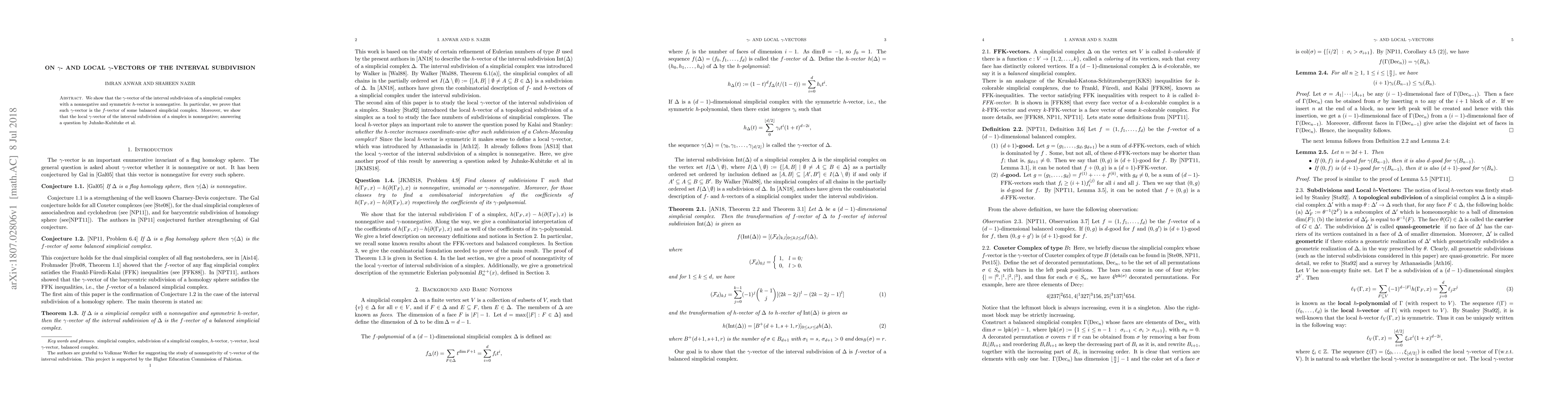 This paper demonstrates that the $\g$-vector of interval subdivisions of simplicial complexes with nonnegative symmetric $h$-vectors is nonnegative and is the $f$-vector of balanced simplicial complexes. Additionally, it proves that the local $\g$-vector of simplex interval subdivisions is also nonnegative, addressing a query by Juhnke-Kubitzke et al.
