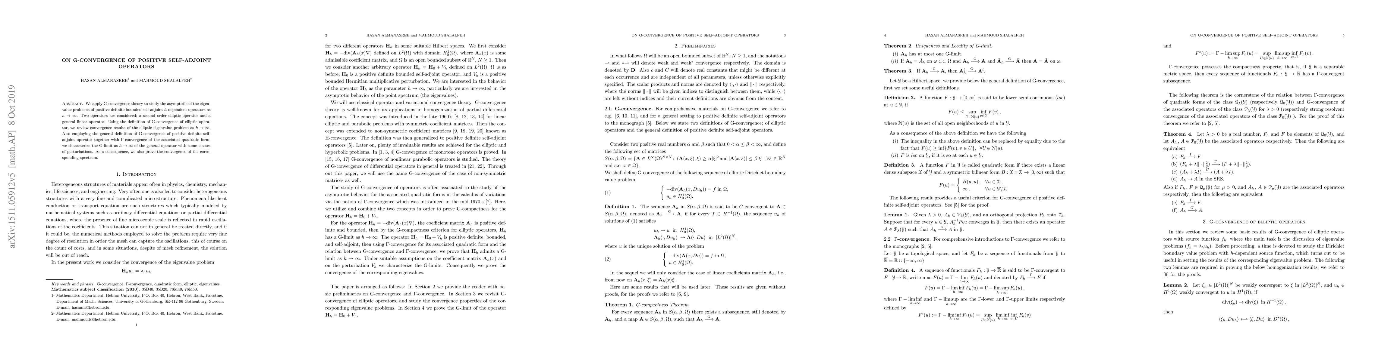 This paper investigates the G-convergence of positive self-adjoint operators, focusing on the asymptotic behavior of eigenvalue problems for $h$-dependent operators as $h\to\infty$. It applies G-convergence theory to both a second-order elliptic operator and a general linear operator, proving the convergence of their spectra and characterizing the limits under certain perturbations.