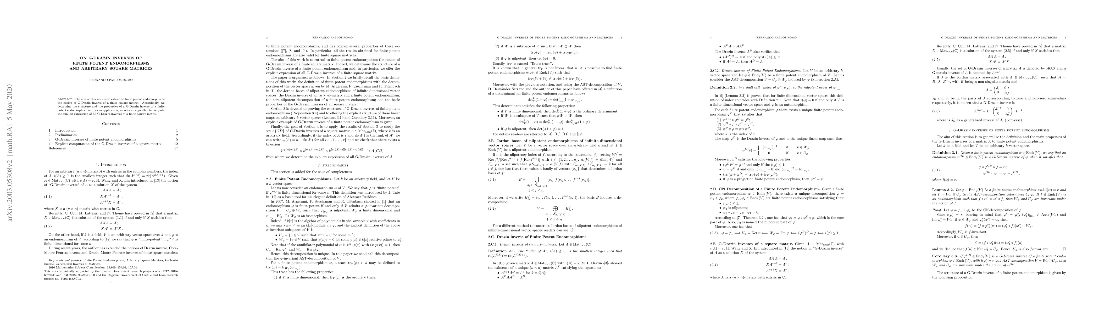 This paper extends the concept of G-Drazin inverse to finite potent endomorphisms, detailing their structure and properties. It also provides an algorithm to compute the explicit expression of all G-Drazin inverses for finite square matrices.