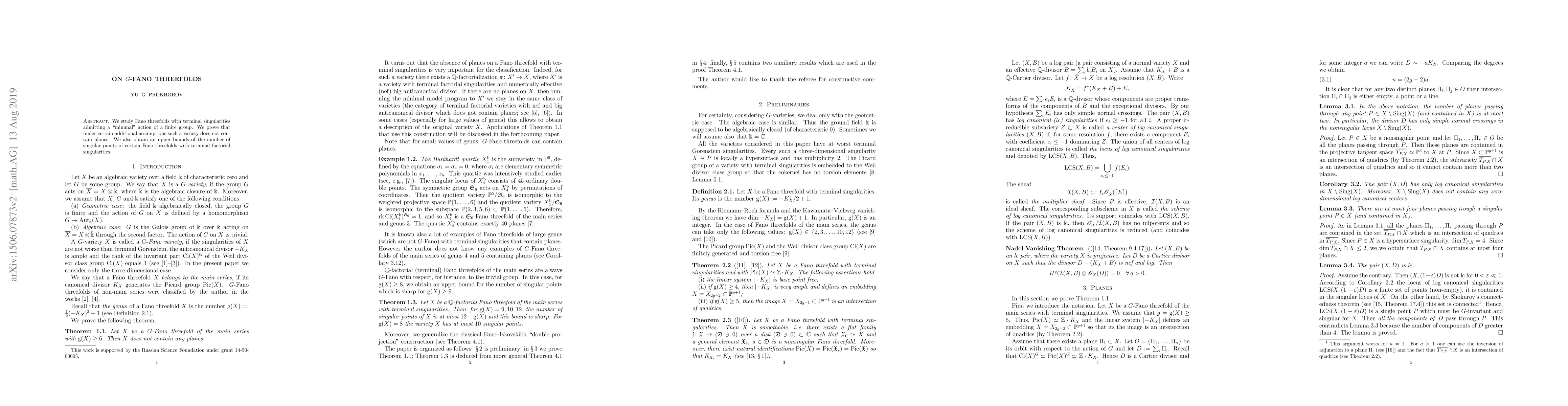 This paper investigates Fano threefolds with terminal singularities under a minimal finite group action, proving they lack planes under specific conditions and establishing an upper bound for the number of singular points in certain Fano threefolds with factorial singularities.