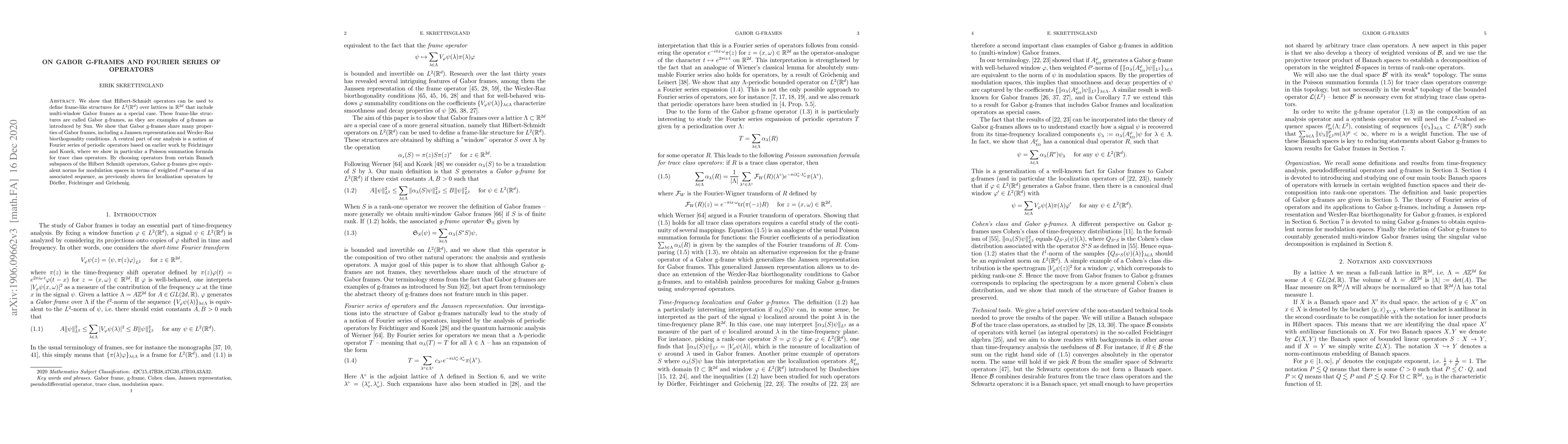 This paper introduces Gabor g-frames, a frame-like structure for $L^2(\mathbb{R}^d)$ based on Hilbert-Schmidt operators, encompassing multi-window Gabor frames. It demonstrates their properties, including Janssen representation and biorthogonality, and establishes a Fourier series for periodic operators, revealing a Poisson summation formula for trace class operators.
