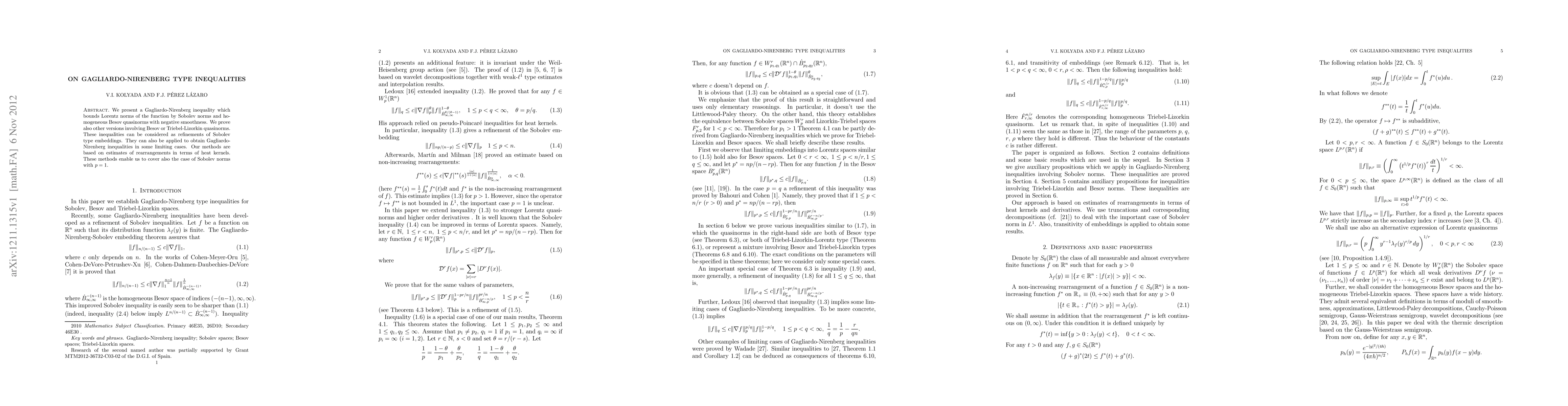 We present a Gagliardo-Nirenberg inequality which bounds Lorentz norms of the function by Sobolev norms and homogeneous Besov quasinorms with negative smoothness. We prove also other versions involving Besov or Triebel-Lizorkin quasinorms. These inequalities can be considered as refinements of Sobolev type embeddings. They can also be applied to obtain Gagliardo-Nirenberg inequalities in some limiting cases. Our methods are based on estimates of rearrangements in terms of heat kernels. These methods enable us to cover also the case of Sobolev norms with p = 1.