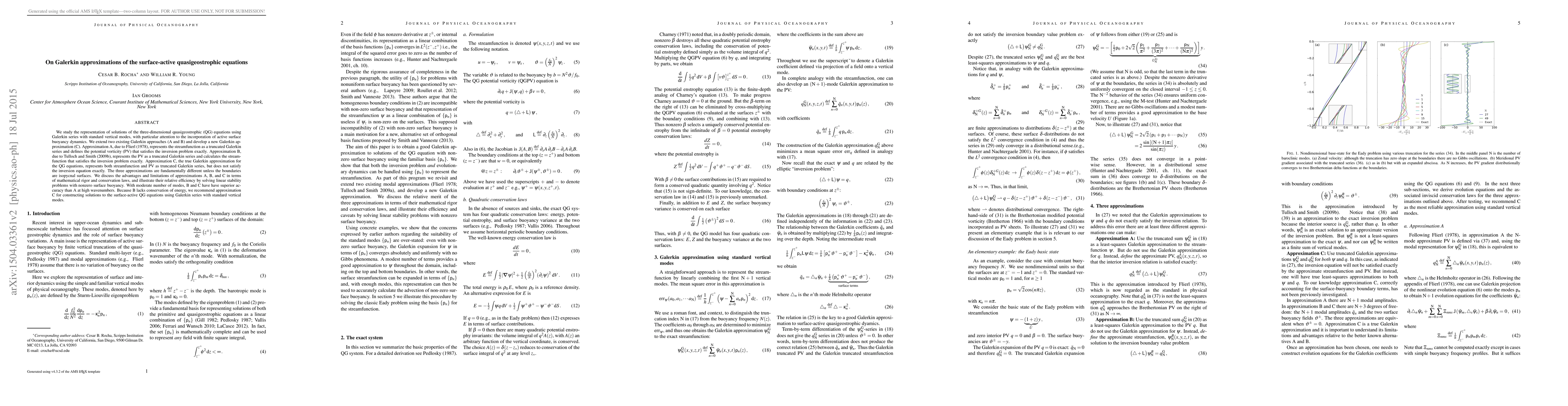 This paper examines three Galerkin approximations for the quasigeostrophic equations, focusing on the representation of solutions with active surface buoyancy dynamics. It recommends the new Galerkin approximation C for constructing solutions due to its superior accuracy and conservation properties, despite not satisfying the inversion equation exactly.