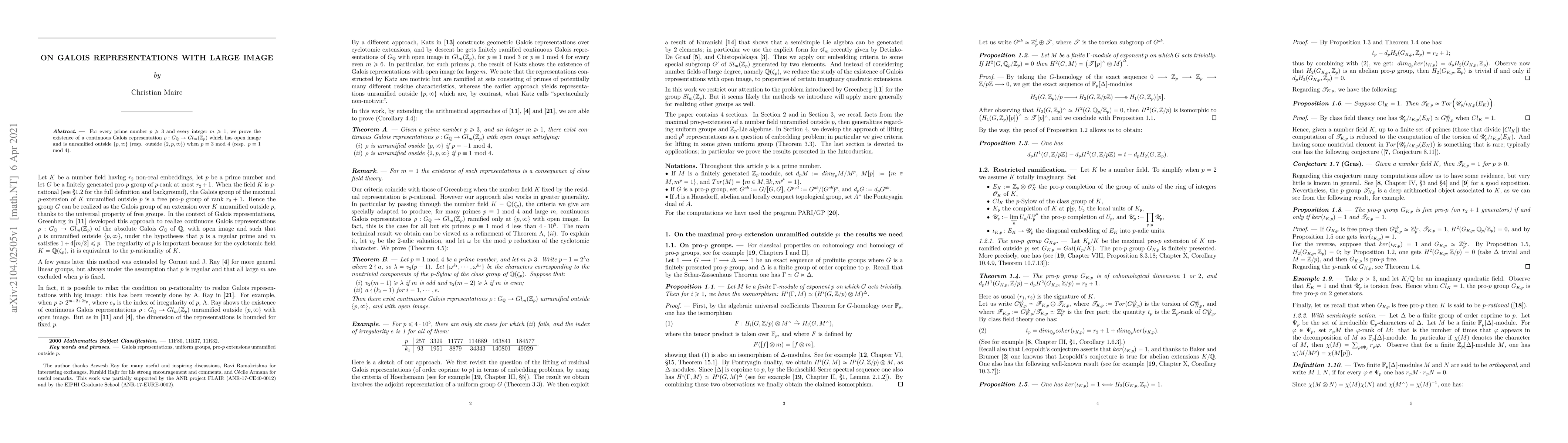 A paper proves the existence of continuous Galois representations with large image over finite fields, showing they can have open images and remain unramified outside specific primes for certain modular conditions.