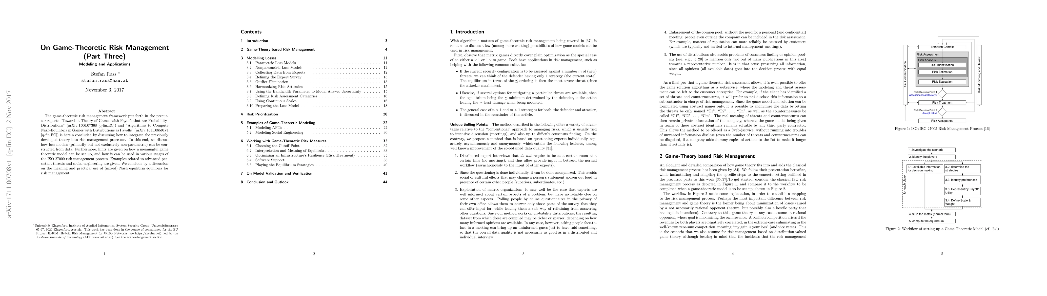 This paper concludes the game-theoretic risk management framework by integrating theoretical models into practical risk management processes, focusing on constructing loss models from data and applying these models within the ISO 27000 framework, with examples on advanced persistent threats and social engineering, and discussing the implications of Nash equilibria.