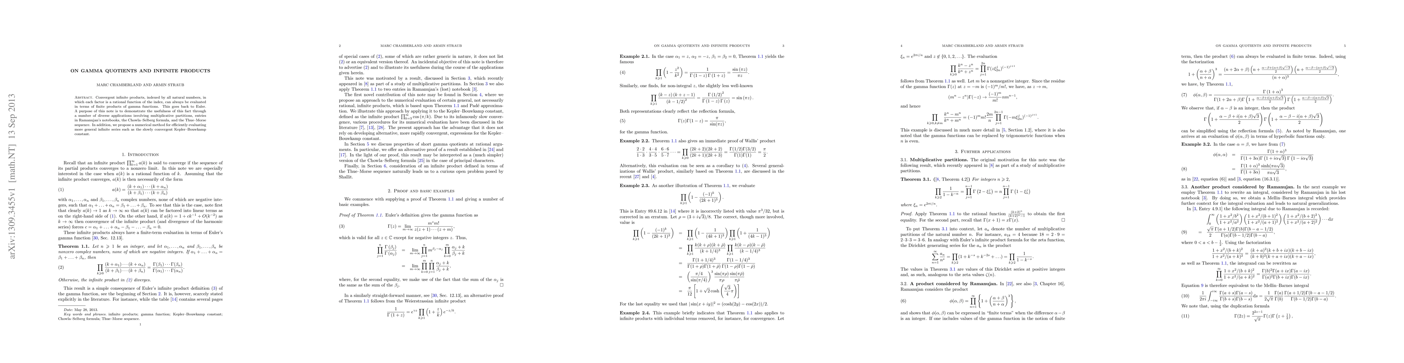 This paper demonstrates how convergent infinite products of rational functions can be expressed using gamma functions, showcasing applications in multiplicative partitions, Ramanujan's notebooks, and the Chowla-Selberg formula, and proposes a numerical method for evaluating slowly convergent series like the Kepler-Bouwkamp constant.