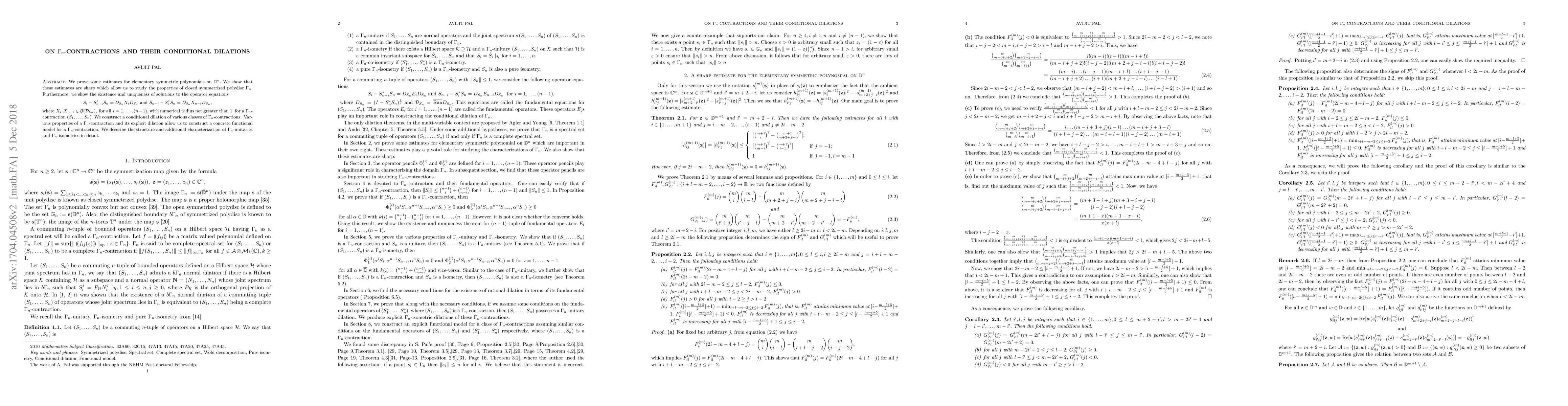 We prove some estimates for elementary symmetric polynomials on $\mathbb D^n.$ We show that these estimates are sharp which allow us to study the properties of closed symmetrized polydisc $\Gamma_n.$ Furthermore, we show the existence and uniqueness of solutions to the operator equations $$S_i-S_{n-i}^*S_n=D_{S_n}X_iD_{S_n}~~{\rm{and}}~~S_{n-i}-S_{i}^*S_n=D_{S_n}X_{n-i}D_{S_n},$$ where $X_i,X_{n-i}\in \mathcal B(\mathcal D_{S_n}), ~{\rm{for ~all~}} i=1,\ldots,(n-1),$ with numerical radius not greater than $1,$ for a $\Gamma_n$-contraction $(S_1,\ldots, S_n).$ We construct a conditional dilation of various classes of $\Gamma_n$-contractions. Various properties of a $\Gamma_n$-contraction and its explicit dilation allow us to construct a concrete functional model for a $\Gamma_n$-contraction. We describe the structure and additional characterization of $\Gamma_n$-unitaries and $\Gamma_n$-isometries in detail.