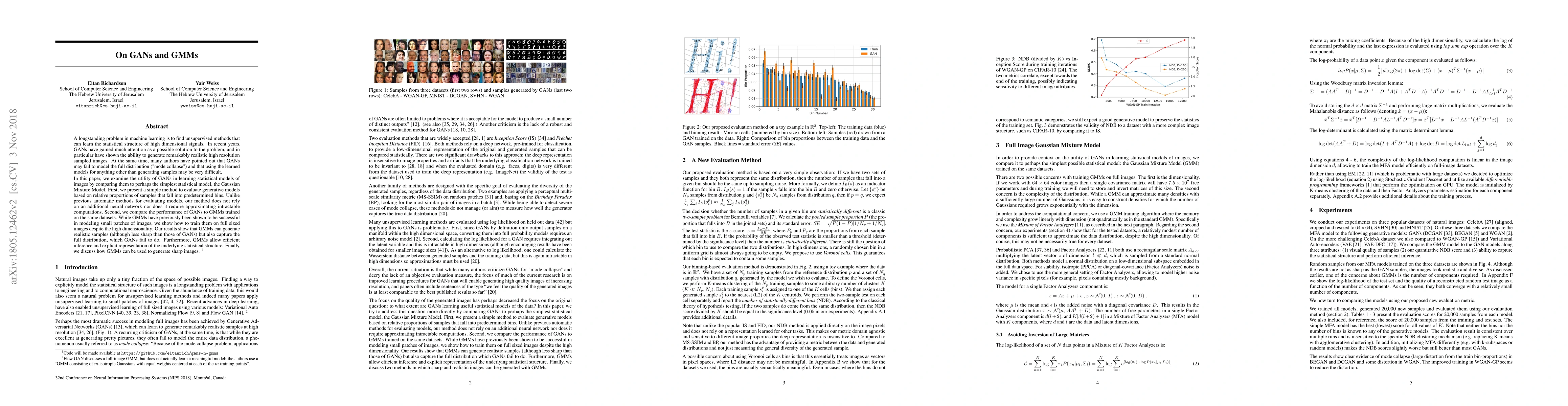 A longstanding problem in machine learning is to find unsupervised methods that can learn the statistical structure of high dimensional signals. In recent years, GANs have gained much attention as a possible solution to the problem, and in particular have shown the ability to generate remarkably realistic high resolution sampled images. At the same time, many authors have pointed out that GANs may fail to model the full distribution ("mode collapse") and that using the learned models for anything other than generating samples may be very difficult. In this paper, we examine the utility of GANs in learning statistical models of images by comparing them to perhaps the simplest statistical model, the Gaussian Mixture Model. First, we present a simple method to evaluate generative models based on relative proportions of samples that fall into predetermined bins. Unlike previous automatic methods for evaluating models, our method does not rely on an additional neural network nor does it require approximating intractable computations. Second, we compare the performance of GANs to GMMs trained on the same datasets. While GMMs have previously been shown to be successful in modeling small patches of images, we show how to train them on full sized images despite the high dimensionality. Our results show that GMMs can generate realistic samples (although less sharp than those of GANs) but also capture the full distribution, which GANs fail to do. Furthermore, GMMs allow efficient inference and explicit representation of the underlying statistical structure. Finally, we discuss how GMMs can be used to generate sharp images.