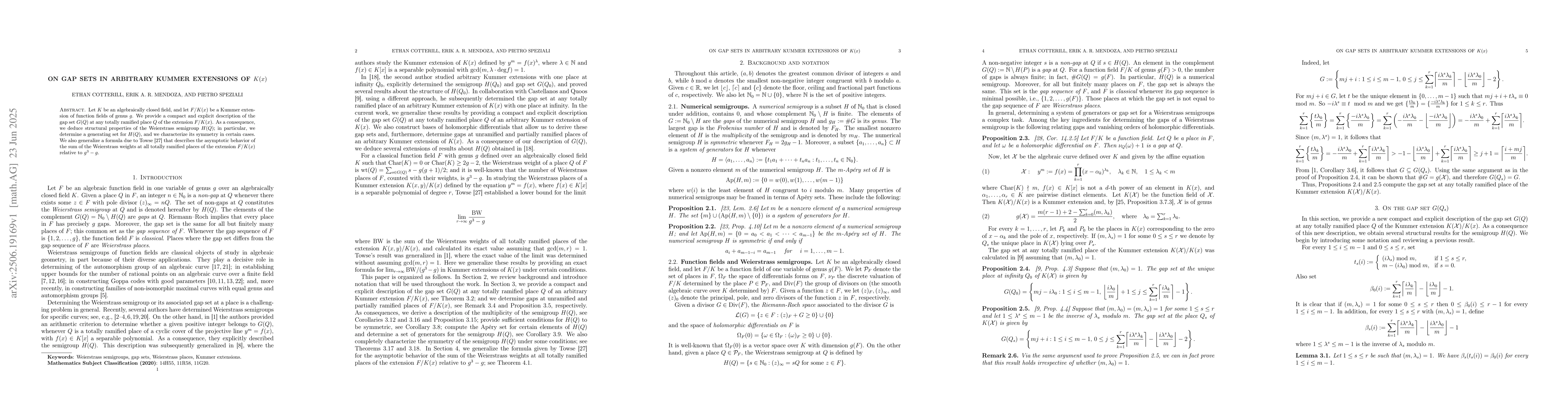 Let $K$ be an algebraically closed field, and let $F/K(x)$ be a Kummer extension of function fields of genus $g$. We provide a compact and explicit description of the gap set $G(Q)$ at any totally ramified place $Q$ of the extension $F/K(x)$. As a consequence, we deduce structural properties of the Weierstrass semigroup $H(Q)$; in particular, we determine a generating set for $H(Q)$, and we characterize its symmetry in certain cases. We also generalize a formula due to Towse that describes the asymptotic behavior of the sum of the Weierstrass weights at all totally ramified places of the extension $F/K(x)$ relative to $g^3-g$.