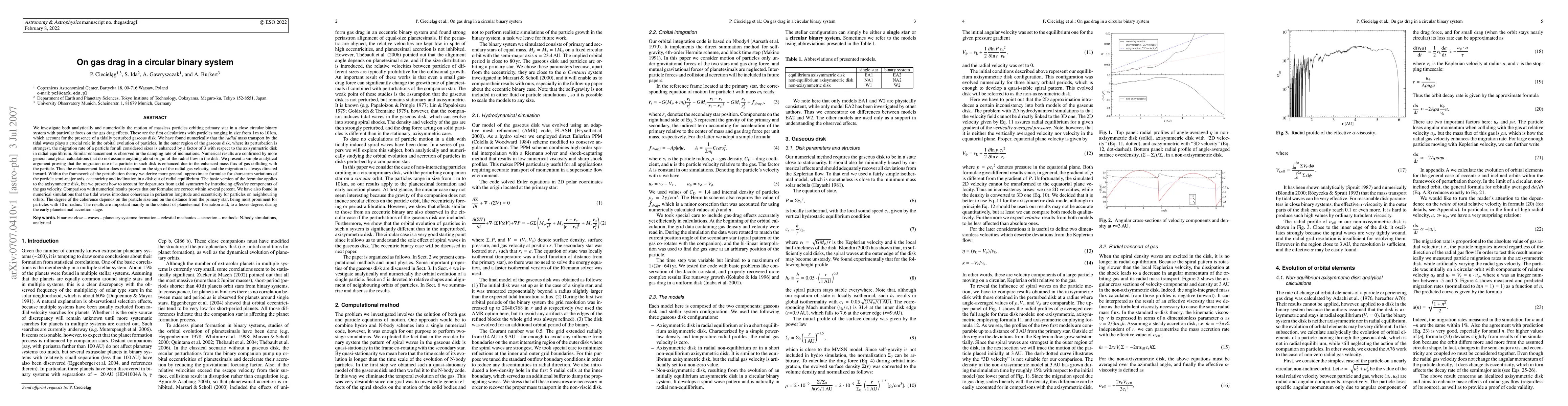 We investigate both analytically and numerically the motion of massless particles orbiting primary star in a close circular binary system with particular focus on the gas drag effects. These are the first calculations with particles ranging in size from 1m to 10km, which account for the presence of a tidally perturbed gaseous disk. We have found numerically that the radial mass transport by the tidal waves plays a crucial role in the orbital evolution of particles. Numerical results are confirmed analytical calculations that do not assume anything about origin of the radial flow in the disk. We demonstrate that the migration rate of a particle in a disk out of radial equilibrium is enhanced due to the enhanced mass flux of gas colliding with the particle and the migration is always directed inward regardless of the sign of the radial gas velocity. Within the framework of the perturbation theory we derive general, formulae for short-term variations of the particle semi-major axis, eccentricity and inclination in such disk. The formulae account for departures from axial symmetry by introducing effective components of the gas velocity. They agree with numerical results within several percent. We have also found in numerical simulations that the tidal waves introduce coherence in periastron longitude and eccentricity for particles on neighbouring orbits. The degree of the coherence depends on the particle size and on the distance from the primary star, being most prominent for particles with 10m radius. The results are important mainly in the context of planetesimal formation and, to a lesser degree, during the early planetesimal accretion stage.