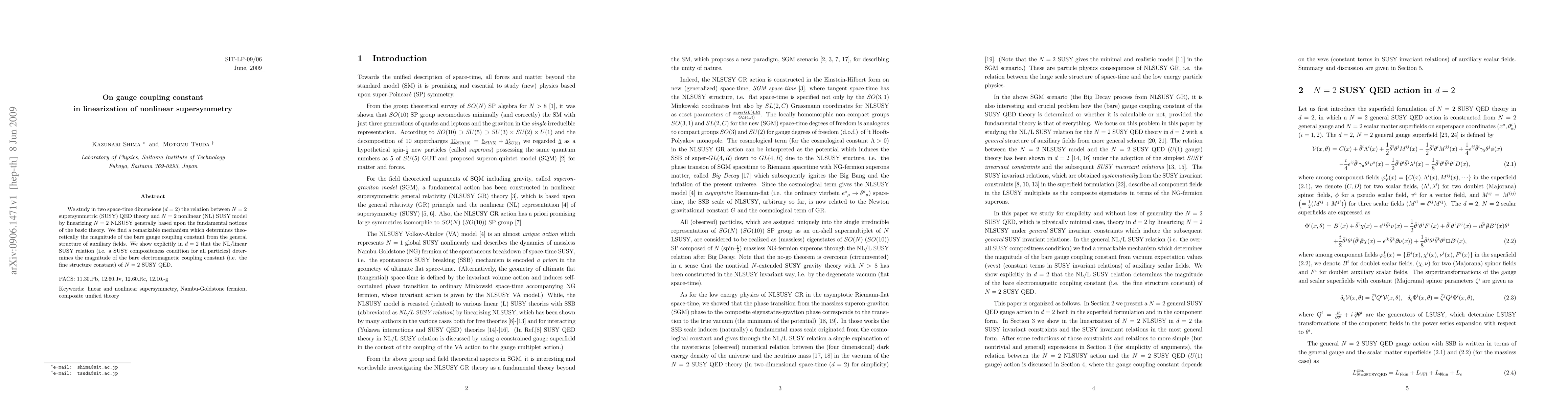 We study in two space-time dimensions (d = 2) the relation between N = 2 supersymmetric (SUSY) QED theory and N = 2 nonlinear (NL) SUSY model by linearizing N = 2 NLSUSY generally based upon the fundamental notions of the basic theory. We find a remarkable mechanism which determines theoretically the magnitude of the bare gauge coupling constant from the general structure of auxiliary fields. We show explicitly in d = 2 that the NL/linear SUSY relation (i.e. a SUSY compositeness condition for all particles) determines the magnitude of the bare electromagnetic coupling constant (i.e. the fine structure constant) of N = 2 SUSY QED.