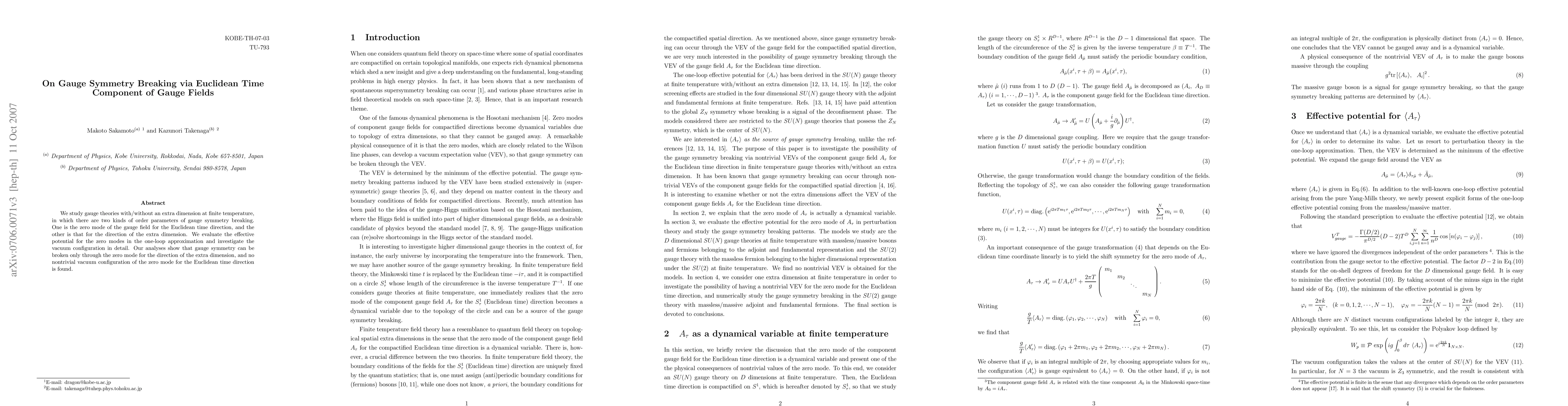 This paper investigates gauge symmetry breaking in theories with and without extra dimensions at finite temperature, focusing on two types of order parameters. It finds that gauge symmetry is broken only through the zero mode in the extra dimension direction, with no nontrivial vacuum configuration for the Euclidean time direction.