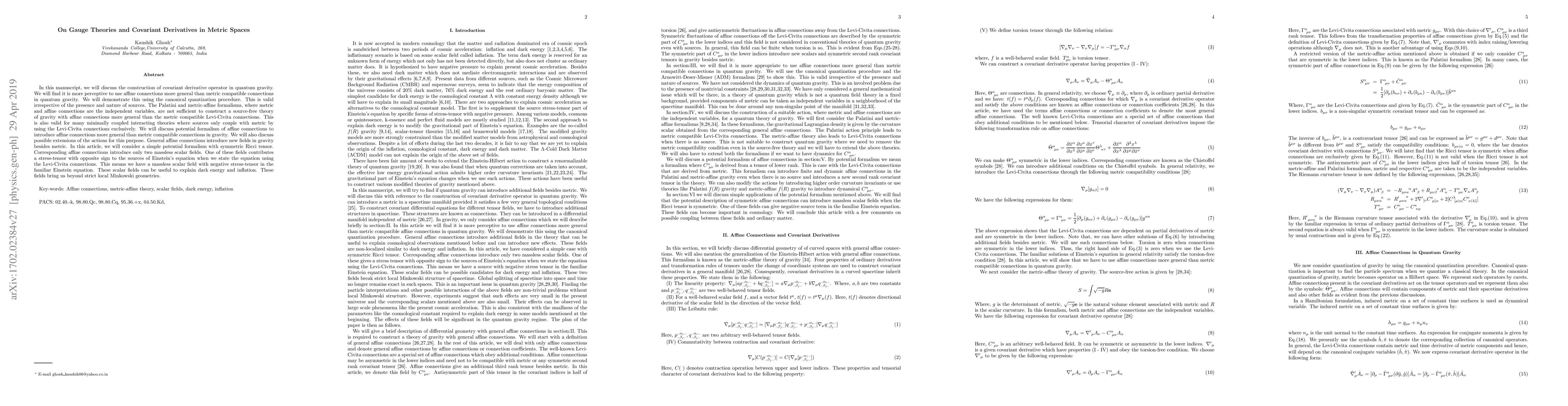 This paper explores the construction of covariant derivative operators in quantum gravity using affine connections that are more general than metric-compatible Levi-Civita connections. It proposes a potential formalism introducing new fields, including massless scalar fields, which may help explain dark energy and inflation, moving beyond local Minkowski geometries.
