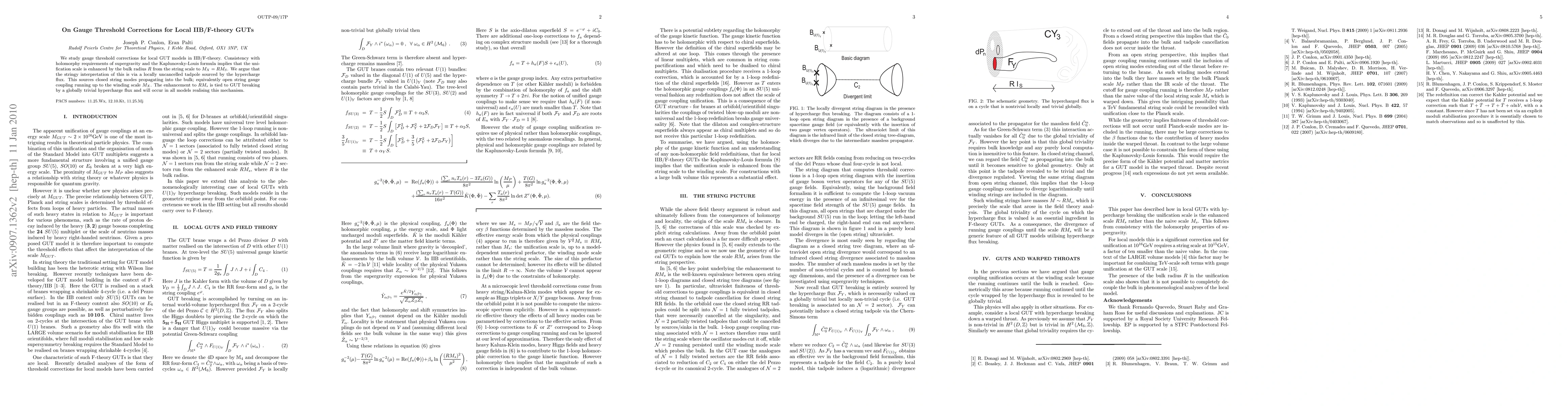 This paper investigates gauge threshold corrections in local GUT models within IIB/F-theory, demonstrating that the unification scale is elevated by the bulk radius R, shifting from the string scale to M_X = R M_S. The enhancement is attributed to a locally uncancelled tadpole from hypercharge flux, leading to closed string modes and open string gauge coupling running up to the winding scale M_X.