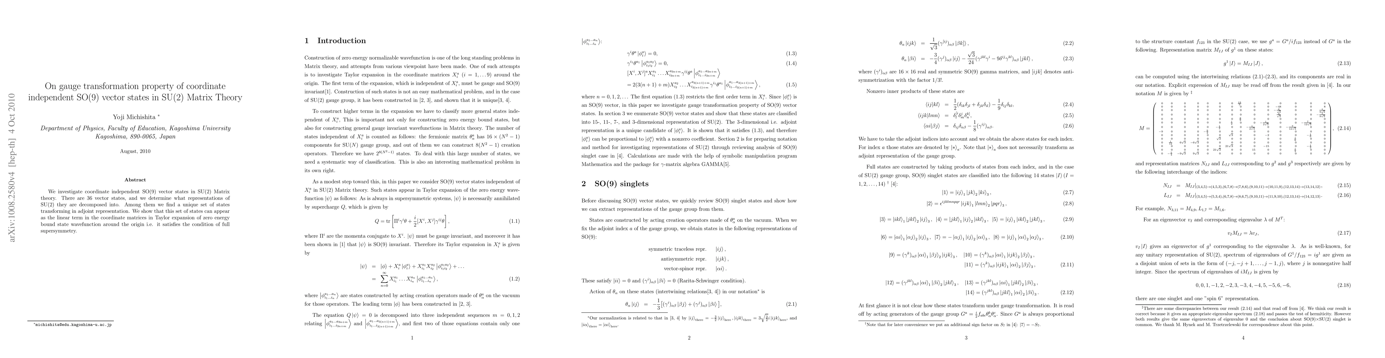 We investigate coordinate independent SO(9) vector states in SU(2) Matrix theory. There are 36 vector states, and we determine what representations of SU(2) they are decomposed into. Among them we find a unique set of states transforming in adjoint representation. We show that this set of states can appear as the linear term in the coordinate matrices in Taylor expansion of zero energy bound state wavefunction around the origin i.e. it satisfies the condition of full supersymmetry.