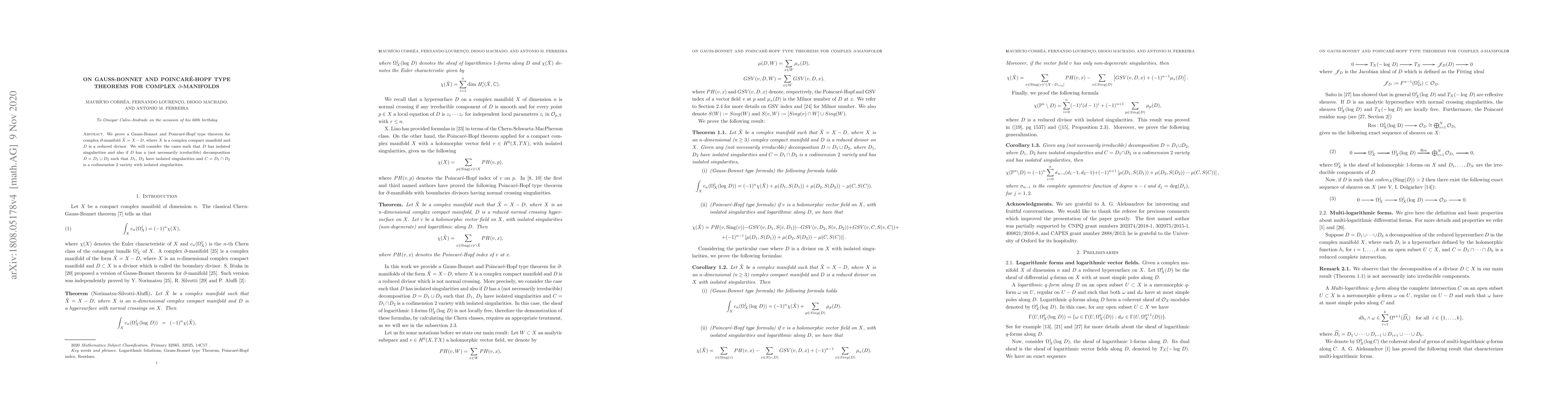 This paper proves Gauss-Bonnet and Poincar\'e-Hopf theorems for complex $\partial$-manifolds $\tilde{X} = X - D$, where $X$ is a compact complex manifold and $D$ is a reduced divisor. It considers cases with isolated singularities and decompositions of $D$ into components with isolated singularities.
