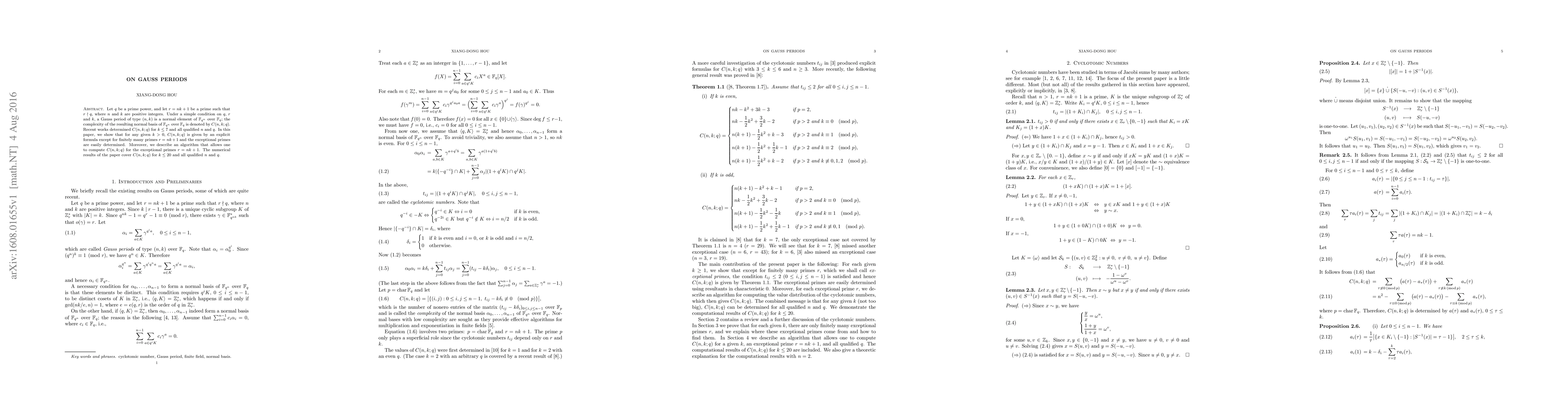 Let $q$ be a prime power, and let $r=nk+1$ be a prime such that $r\nmid q$, where $n$ and $k$ are positive integers. Under a simple condition on $q$, $r$ and $k$, a Gauss period of type $(n,k)$ is a normal element of $\Bbb F_{q^n}$ over $\Bbb F_q$; the complexity of the resulting normal basis of $\Bbb F_{q^n}$ over $\Bbb F_q$ is denoted by $C(n,k;q)$. Recent works determined $C(n,k;q)$ for $k\le 7$ and all qualified $n$ and $q$. In this paper, we show that for any given $k>0$, $C(n,k;q)$ is given by an explicit formula except for finitely many primes $r=nk+1$ and the exceptional primes are easily determined. Moreover, we describe an algorithm that allows one to compute $C(n,k;q)$ for the exceptional primes $r=nk+1$. The numerical results of the paper cover $C(n,k;q)$ for $k\le 20$ and all qualified $n$ and $q$.