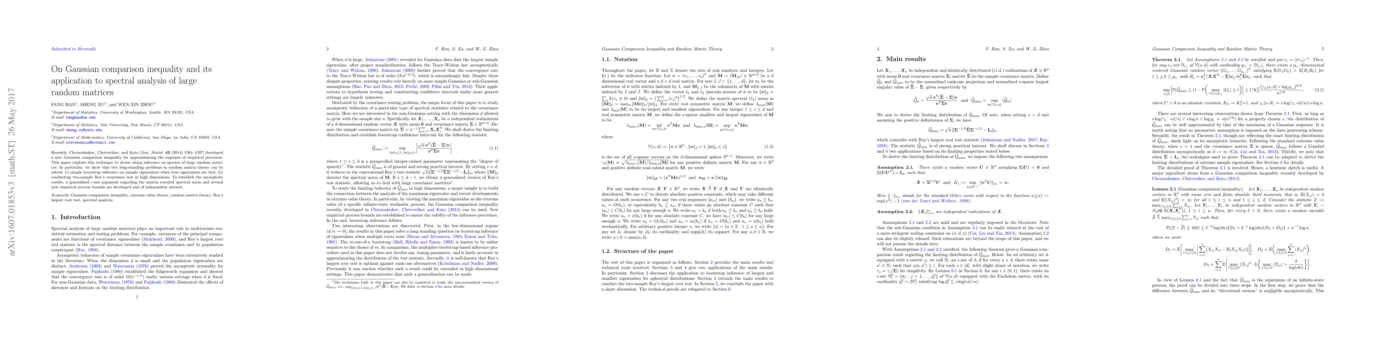 Recently, Chernozhukov, Chetverikov, and Kato [Ann. Statist. 42 (2014) 1564--1597] developed a new Gaussian comparison inequality for approximating the suprema of empirical processes. This paper exploits this technique to devise sharp inference on spectra of large random matrices. In particular, we show that two long-standing problems in random matrix theory can be solved: (i) simple bootstrap inference on sample eigenvalues when true eigenvalues are tied; (ii) conducting two-sample Roy's covariance test in high dimensions. To establish the asymptotic results, a generalized $\epsilon$-net argument regarding the matrix rescaled spectral norm and several new empirical process bounds are developed and of independent interest.