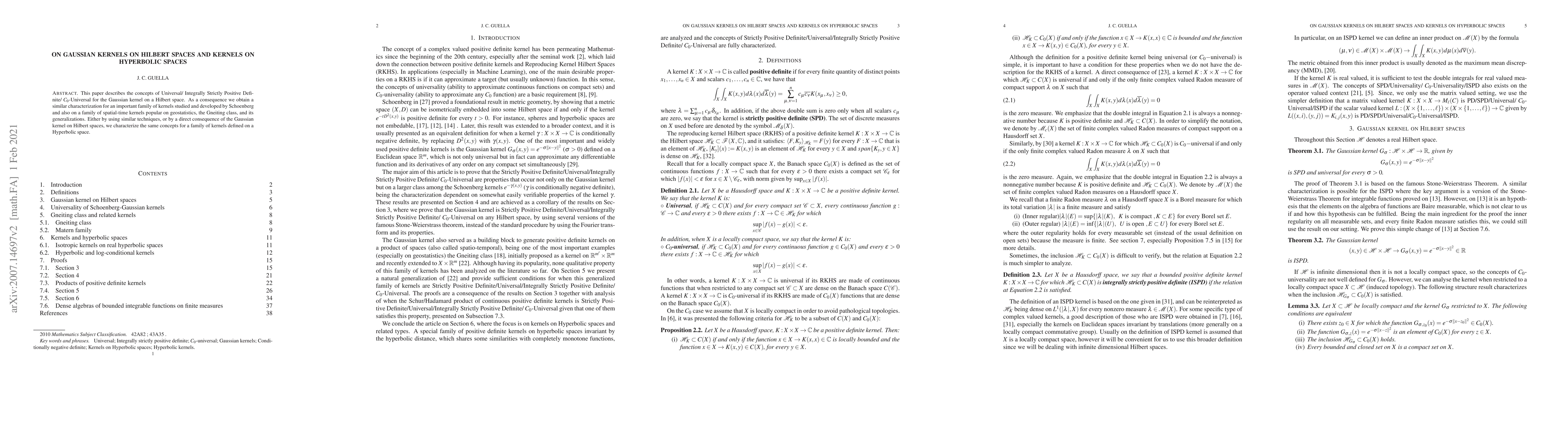 This paper explores the properties of Gaussian kernels on Hilbert spaces, including Universal and $C_{0}$-Universal characteristics, and extends these findings to the Gneiting class of kernels used in geostatistics. It also characterizes similar properties for kernels defined on Hyperbolic spaces.
