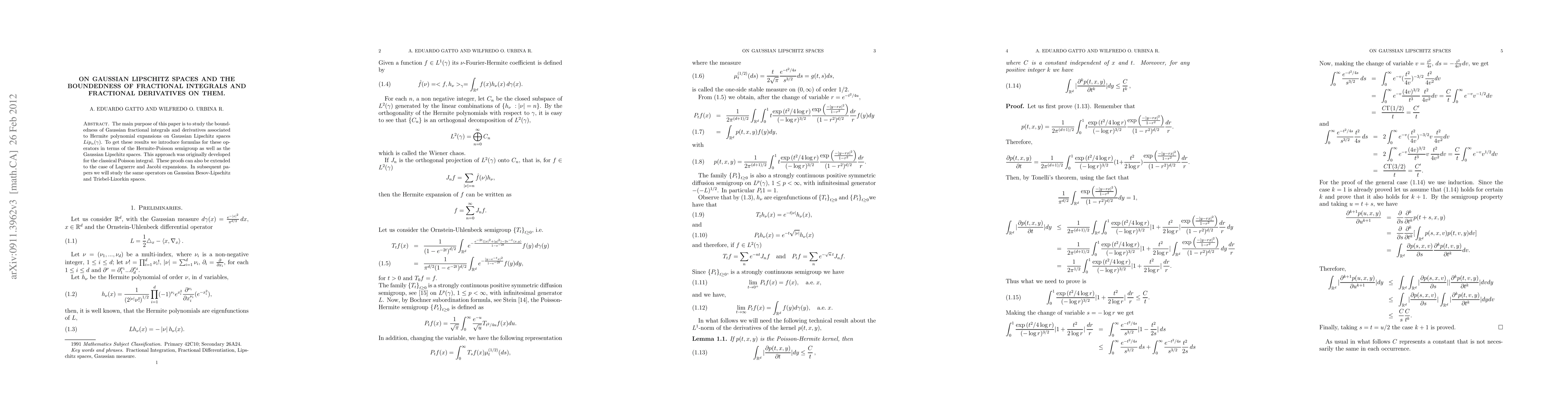 This paper introduces Gaussian Lipschitz spaces and examines the boundedness of fractional integral and derivative operators on these spaces. The methods presented offer alternative proofs for classical cases and extend to Laguerre and Jacobi expansions.