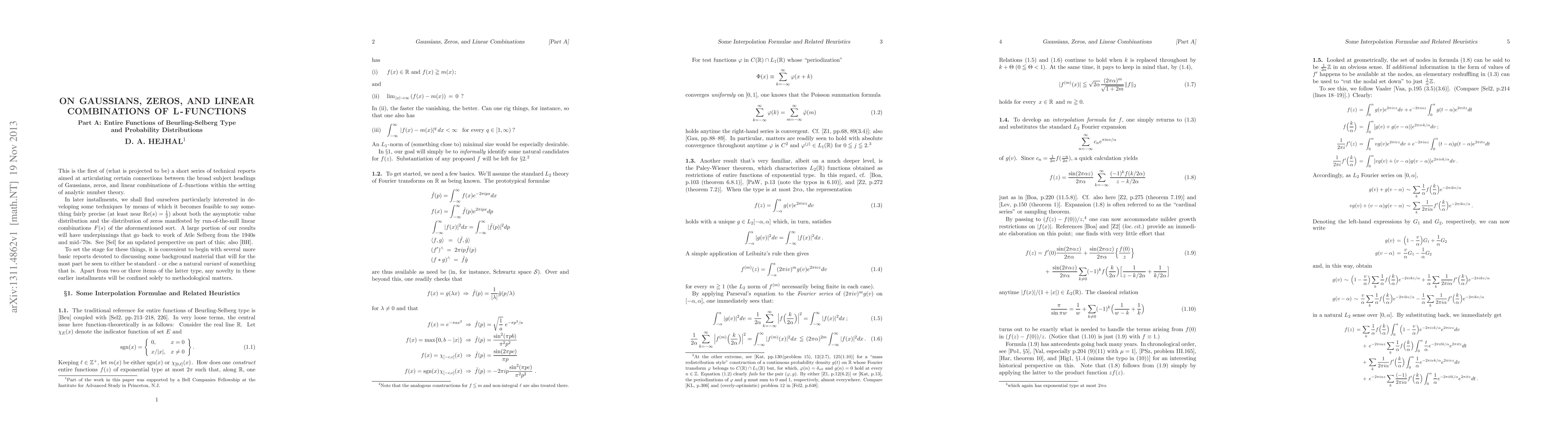 This is the first installment in a series of papers devoted to examining certain aspects of the asymptotic value distribution and distribution of zeros manifested by members of a broad class of linear combinations of L-functions in the vicinity of the critical line Re(s) = 1/2. The results that we ultimately plan to discuss will entail a certain amount of probabilistic underpinning. $\hspace{.16em}$Entire functions of Beurling-Selberg type turn out to provide a very convenient inroad into the type of technical estimate that one needs. $\hspace{.16em}$In the present paper, after first reviewing the basic properties of these functions, we'll proceed to develop several relatively simple (but highly suggestive) probabilistic examples in which the functions' efficacy can be rather plainly seen. The path we take has the added advantage of enabling several key ideas for later developments to already become visible in an embryonic form.