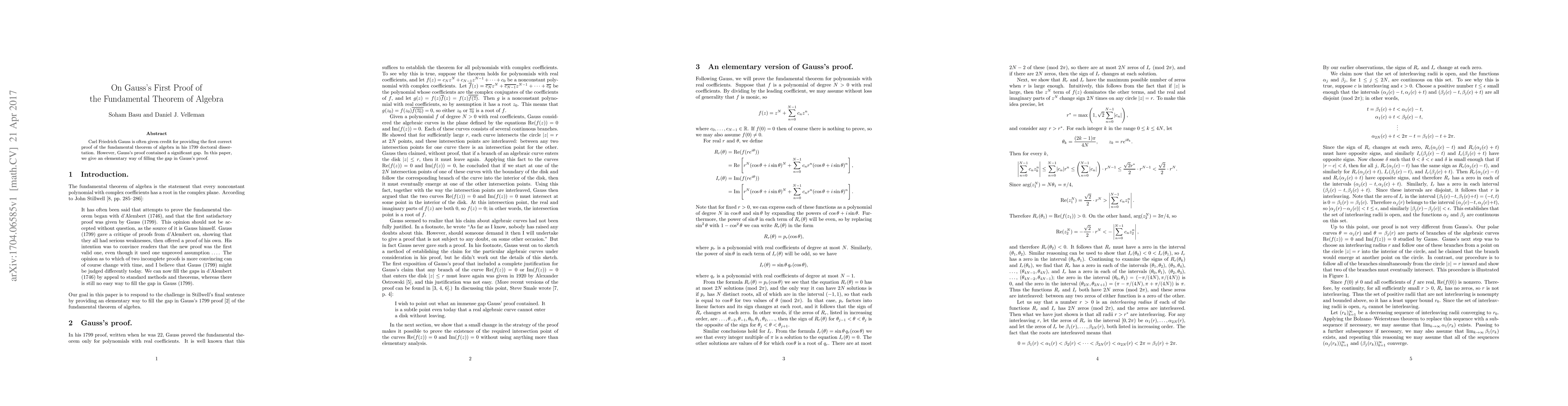 Summary: This paper addresses a significant gap in Carl Friedrich Gauss's original 1799 proof of the fundamental theorem of algebra, offering an elementary method to fill this gap. It aims to provide a more complete understanding of Gauss's groundbreaking work.