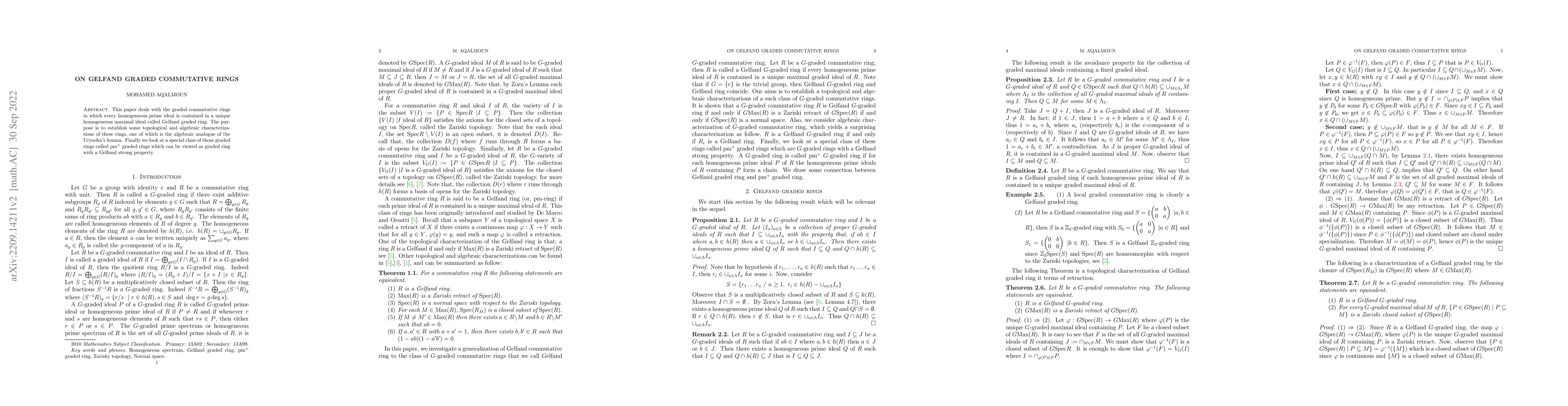 This paper explores Gelfand graded commutative rings where every homogeneous prime ideal is uniquely contained within a homogeneous maximal ideal. It establishes topological and algebraic characterizations, including an algebraic analogue of Urysohn's lemma, and examines pm$^+$ graded rings with a Gelfand strong property.