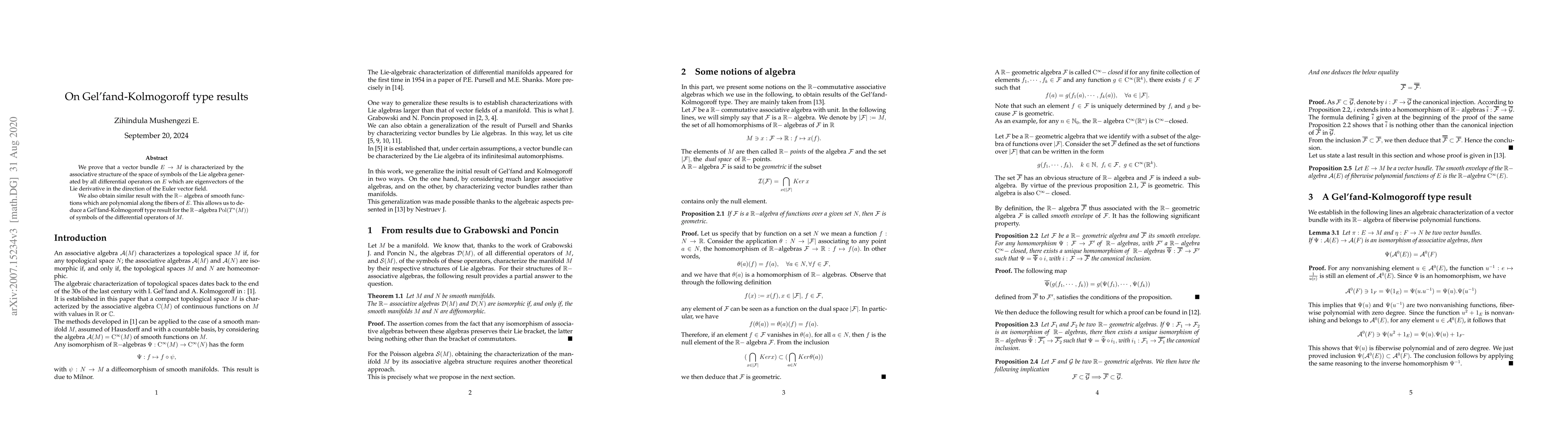 We prove that a vector bundle $ E \to M$ is characterized by the associative structure of the space of symbols of the Lie algebra generated by all differential operators on $E$ which are eigenvectors of the Lie derivative in the direction of the Euler vector field. We also obtain similar result with the $\mathbb{R}-$ algebra of smooth functions which are polynomial along the fibers of $E.$ This allows us to deduce a Gel'fand-Kolmogoroff type result for the $\mathbb{R}-$algebra ${\rm Pol}(T^*(M))$ of symbols of the differential operators of $M.$