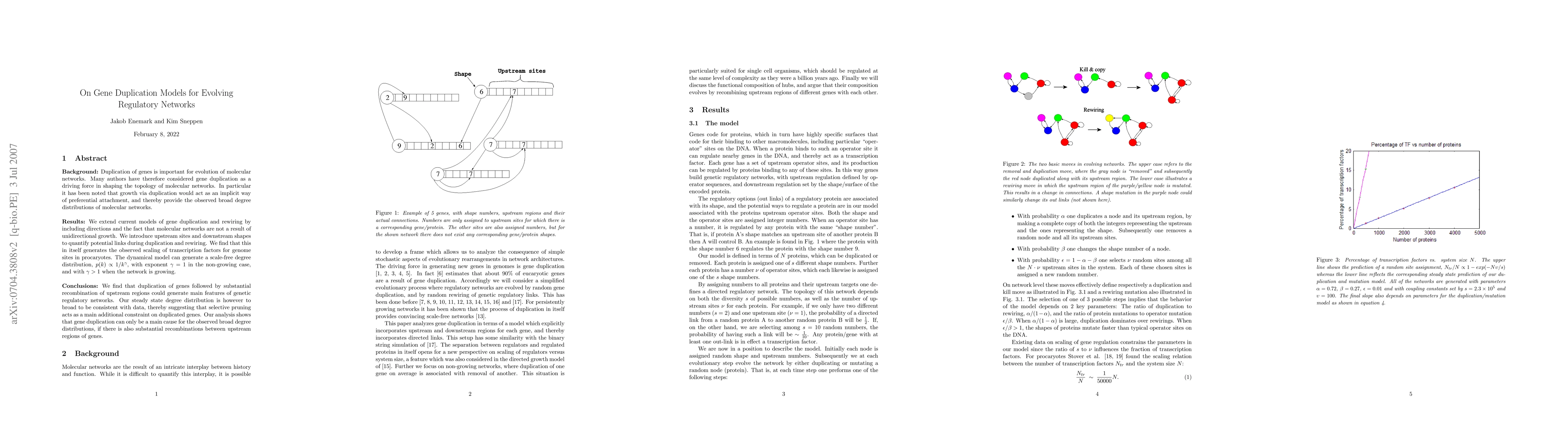 Background: Duplication of genes is important for evolution of molecular networks. Many authors have therefore considered gene duplication as a driving force in shaping the topology of molecular networks. In particular it has been noted that growth via duplication would act as an implicit way of preferential attachment, and thereby provide the observed broad degree distributions of molecular networks. Results: We extend current models of gene duplication and rewiring by including directions and the fact that molecular networks are not a result of unidirectional growth. We introduce upstream sites and downstream shapes to quantify potential links during duplication and rewiring. We find that this in itself generates the observed scaling of transcription factors for genome sites in procaryotes. The dynamical model can generate a scale-free degree distribution, p(k)∝ 1/k^γ, with exponent γ=1 in the non-growing case, and with γ>1 when the network is growing. Conclusions: We find that duplication of genes followed by substantial recombination of upstream regions could generate main features of genetic regulatory networks. Our steady state degree distribution is however to broad to be consistent with data, thereby suggesting that selective pruning acts as a main additional constraint on duplicated genes. Our analysis shows that gene duplication can only be a main cause for the observed broad degree distributions, if there is also substantial recombinations between upstream regions of genes.