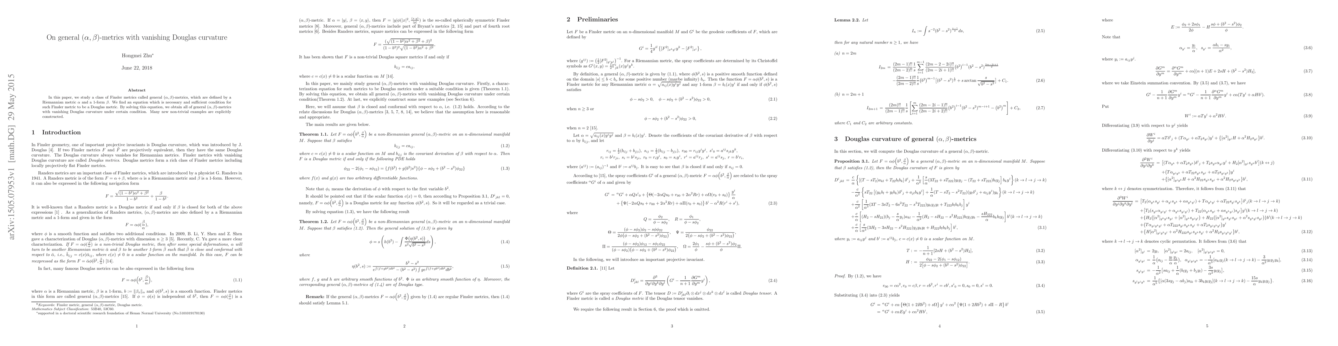 This paper investigates general $(\alpha,\beta)$-metrics, defined by a Riemannian metric $\alpha$ and a $1$-form $\beta$, and identifies a necessary and sufficient condition for them to be Douglas metrics. It provides explicit constructions of new examples of $(\alpha,\beta)$-metrics with vanishing Douglas curvature under specific conditions.