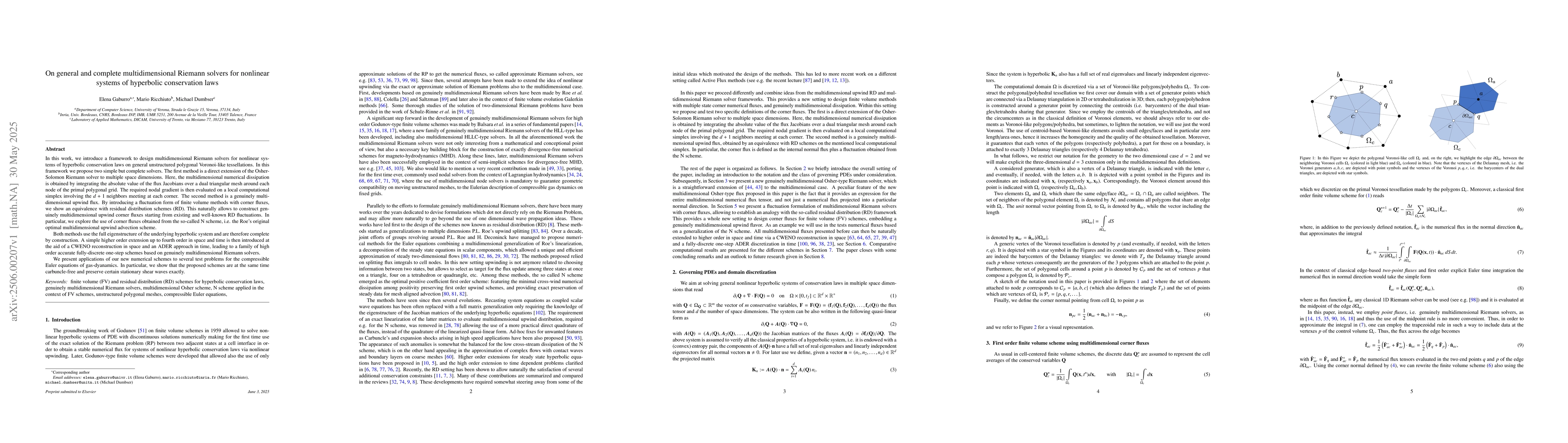 In this work, we introduce a framework to design multidimensional Riemann solvers for nonlinear systems of hyperbolic conservation laws on general unstructured polygonal Voronoi-like tessellations. In this framework we propose two simple but complete solvers. The first method is a direct extension of the Osher-Solomon Riemann solver to multiple space dimensions. Here, the multidimensional numerical dissipation is obtained by integrating the absolute value of the flux Jacobians over a dual triangular mesh around each node of the primal polygonal grid. The required nodal gradient is then evaluated on a local computational simplex involving the d+1 neighbors meeting at each corner. The second method is a genuinely multidimensional upwind flux. By introducing a fluctuation form of finite volume methods with corner fluxes, we show an equivalence with residual distribution schemes (RD). This naturally allows to construct genuinely multidimensional upwind corner fluxes starting from existing and well-known RD fluctuations. In particular, we explore the use of corner fluxes obtained from the so-called N scheme, i.e. the Roe's original optimal multidimensional upwind advection scheme. Both methods use the full eigenstructure of the underlying hyperbolic system and are therefore complete by construction. A simple higher order extension up to fourth order in space and time is then introduced at the aid of a CWENO reconstruction in space and an ADER approach in time, leading to a family of high order accurate fully-discrete one-step schemes based on genuinely multidimensional Riemann solvers. We present applications of our new numerical schemes to several test problems for the compressible Euler equations of gas-dyanamics. In particular, we show that the proposed schemes are at the same time carbuncle-free and preserve certain stationary shear waves exactly.