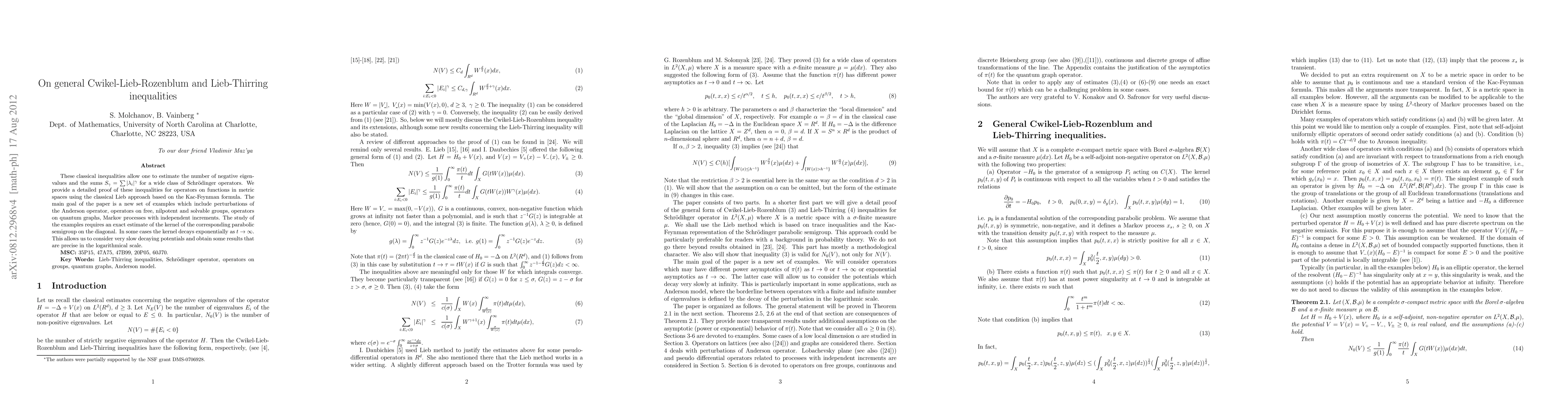 These classical inequalities allow one to estimate the number of negative eigenvalues and the sums $S_{\gamma}=\sum |\lambda_i|^{\gamma}$ for a wide class of Schr\"{o}dinger operators. We provide a detailed proof of these inequalities for operators on functions in metric spaces using the classical Lieb approach based on the Kac-Feynman formula. The main goal of the paper is a new set of examples which include perturbations of the Anderson operator, operators on free, nilpotent and solvable groups, operators on quantum graphs, Markov processes with independent increments. The study of the examples requires an exact estimate of the kernel of the corresponding parabolic semigroup on the diagonal. In some cases the kernel decays exponentially as $t\to \infty $. This allows us to consider very slow decaying potentials and obtain some results that are precise in the logarithmical scale.