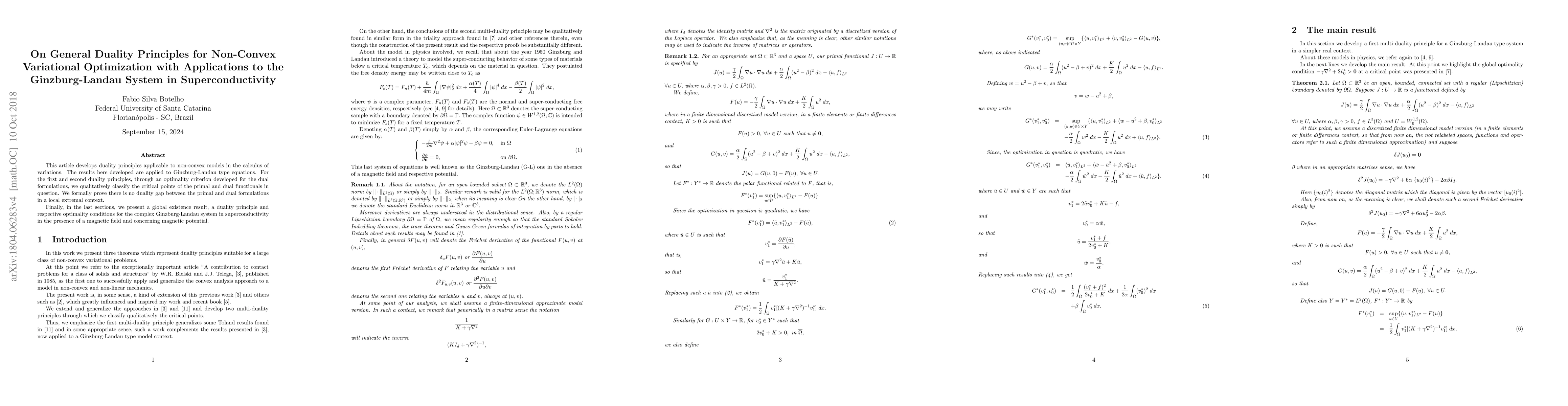 This paper establishes duality principles for non-convex variational optimization, applying them to Ginzburg-Landau equations in superconductivity. It proves the absence of duality gaps and provides optimality conditions for the complex Ginzburg-Landau system under magnetic fields.