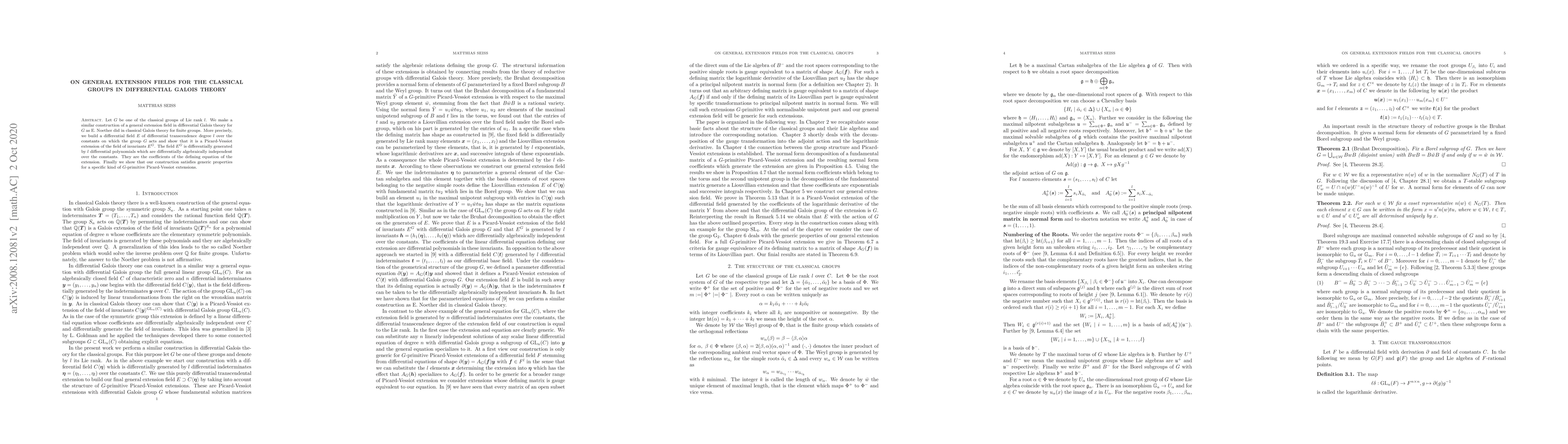 Let $G$ be one of the classical groups of Lie rank $l$. We make a similar construction of a general extension field in differential Galois theory for $G$ as E. Noether did in classical Galois theory for finite groups. More precisely, we build a differential field $E$ of differential transcendence degree $l$ over the constants on which the group $G$ acts and show that it is a Picard-Vessiot extension of the field of invariants $E^G$. The field $E^G$ is differentially generated by $l$ differential polynomials which are differentially algebraically independent over the constants. They are the coefficients of the defining equation of the extension. Finally we show that our construction satisfies generic properties for a specific kind of $G$-primitive Picard-Vessiot extensions.